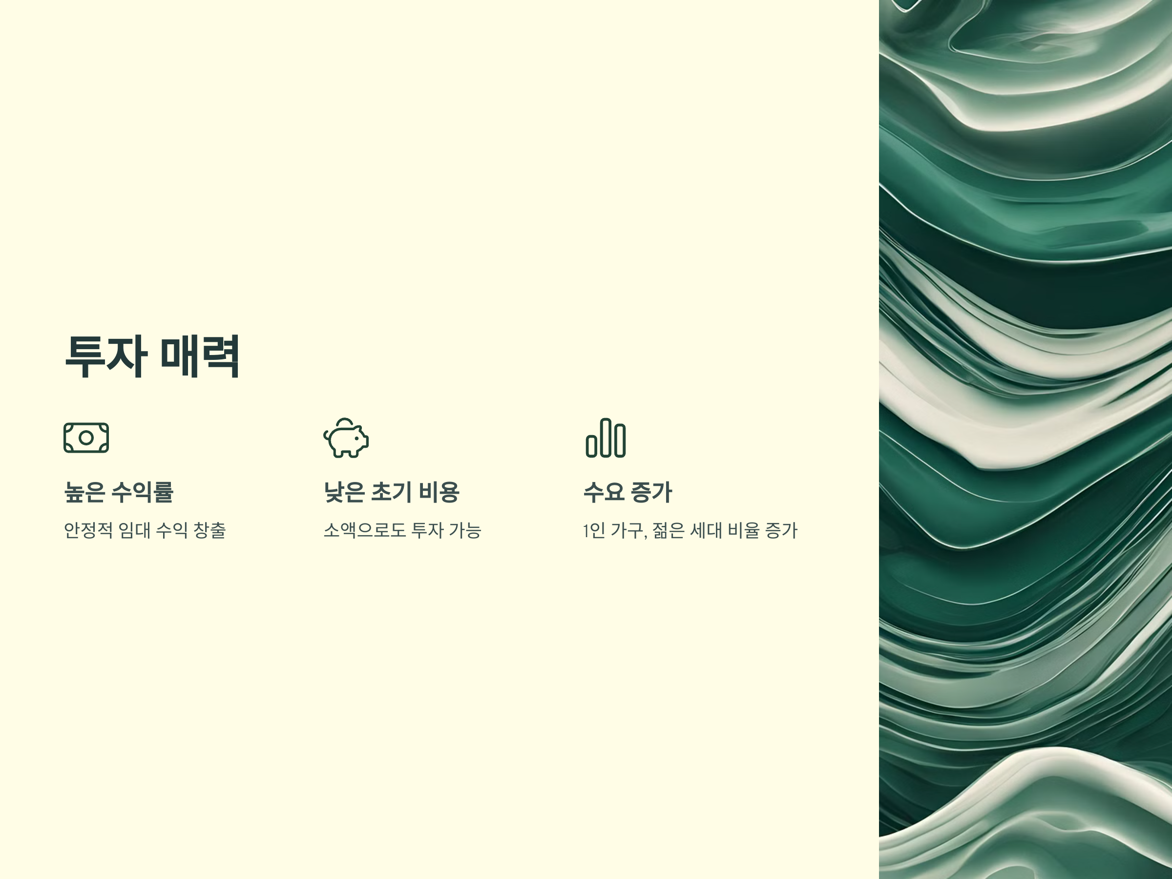 - 상대적으로 낮은 초기 비용: 아파트나 상가와 비교했을 때, 초기 투자 비용이 낮은 편이라 소액으로도 투자가 가능하고, 안정적인 현금 흐름을 얻을 수 있습니다.