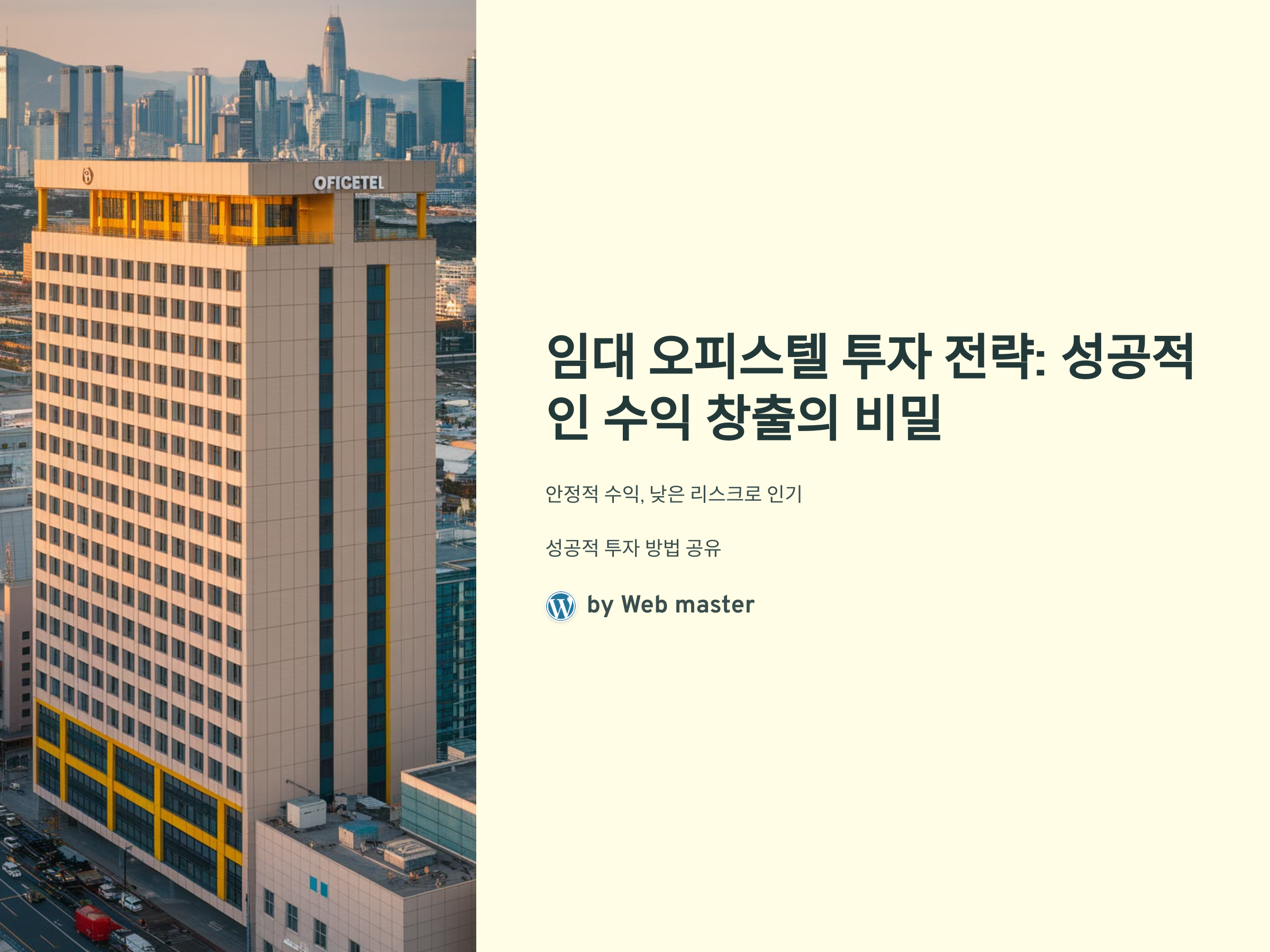 임대 오피스텔은 상대적으로 안정적인 수익을 얻을 수 있는 좋은 투자처입니다. 그러나 충분한 분석과 준비가 필요하며, 실수 없이 제대로 투자하면 꾸준한 수익을 기대할 수 있습니다. 이번 글을 통해 임대 오피스텔 투자에 대한 전략을 잘 이해하셨다면, 여러분의 성공적인 투자로 이어질 것입니다.