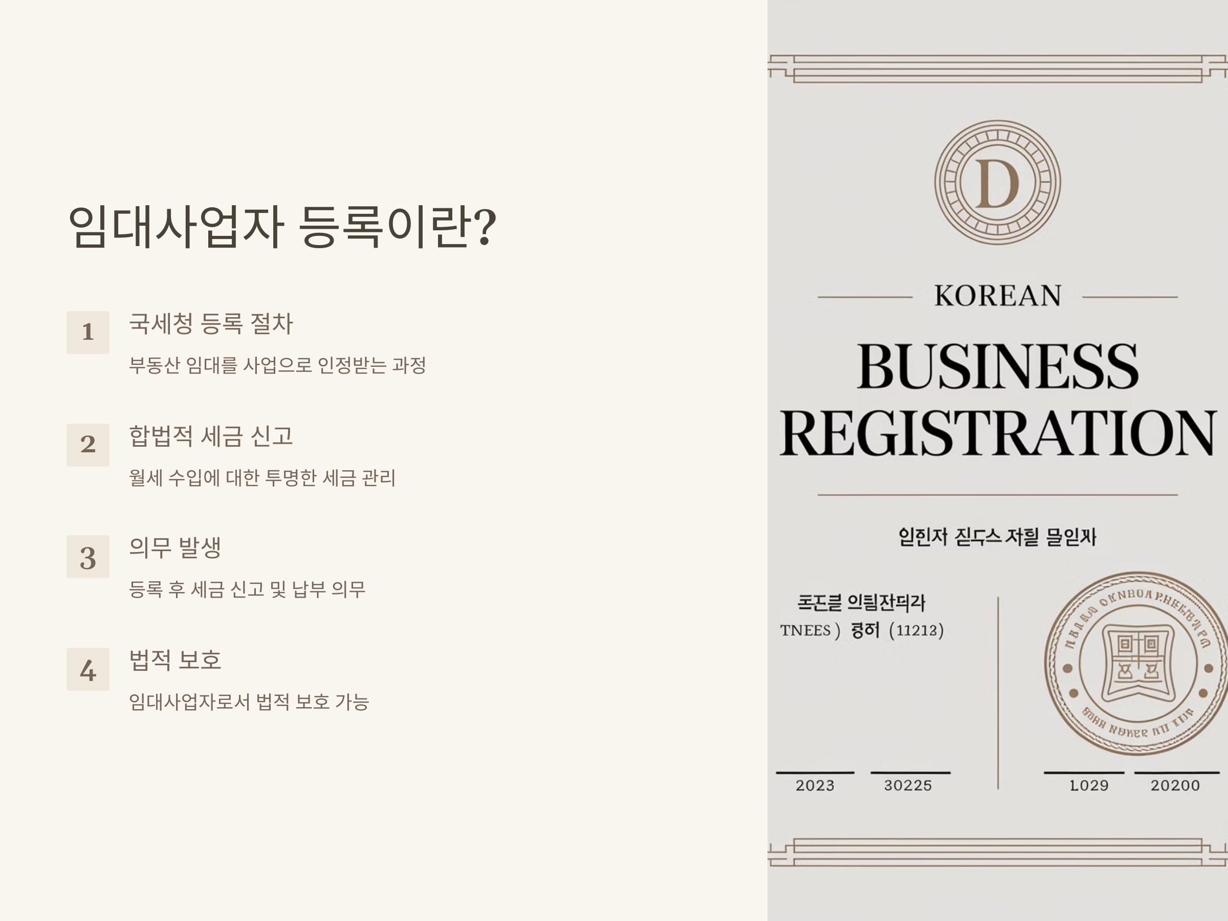 임대사업자 등록은 개인이 부동산을 임대하고 이를 사업으로 운영하려는 경우, 국세청에 신고하여 사업자로 인정받는 절차를 의미합니다. 임대사업자 등록을 통해 월세 수입에 대해 합법적으로 세금 신고를 할 수 있고, 세금 혜택을 받을 수 있습니다. 특히, 임대소득에 대한 과세 방식이 바뀌면서 등록하지 않으면 법적인 문제가 발생할 수 있기 때문에 반드시 등록을 해야 합니다.