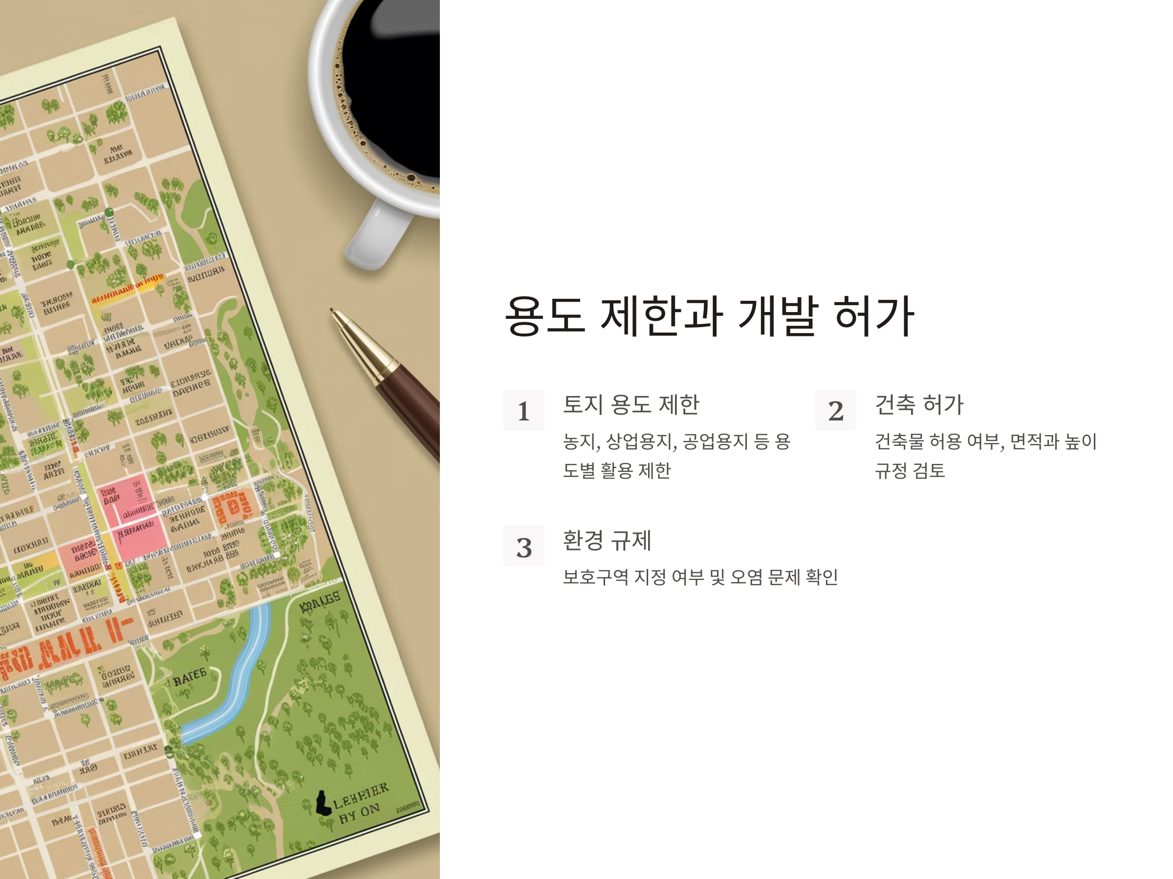 - 건축 허가 여부: 건축물이 허용되는지, 건축 가능 면적과 높이 규정 검토