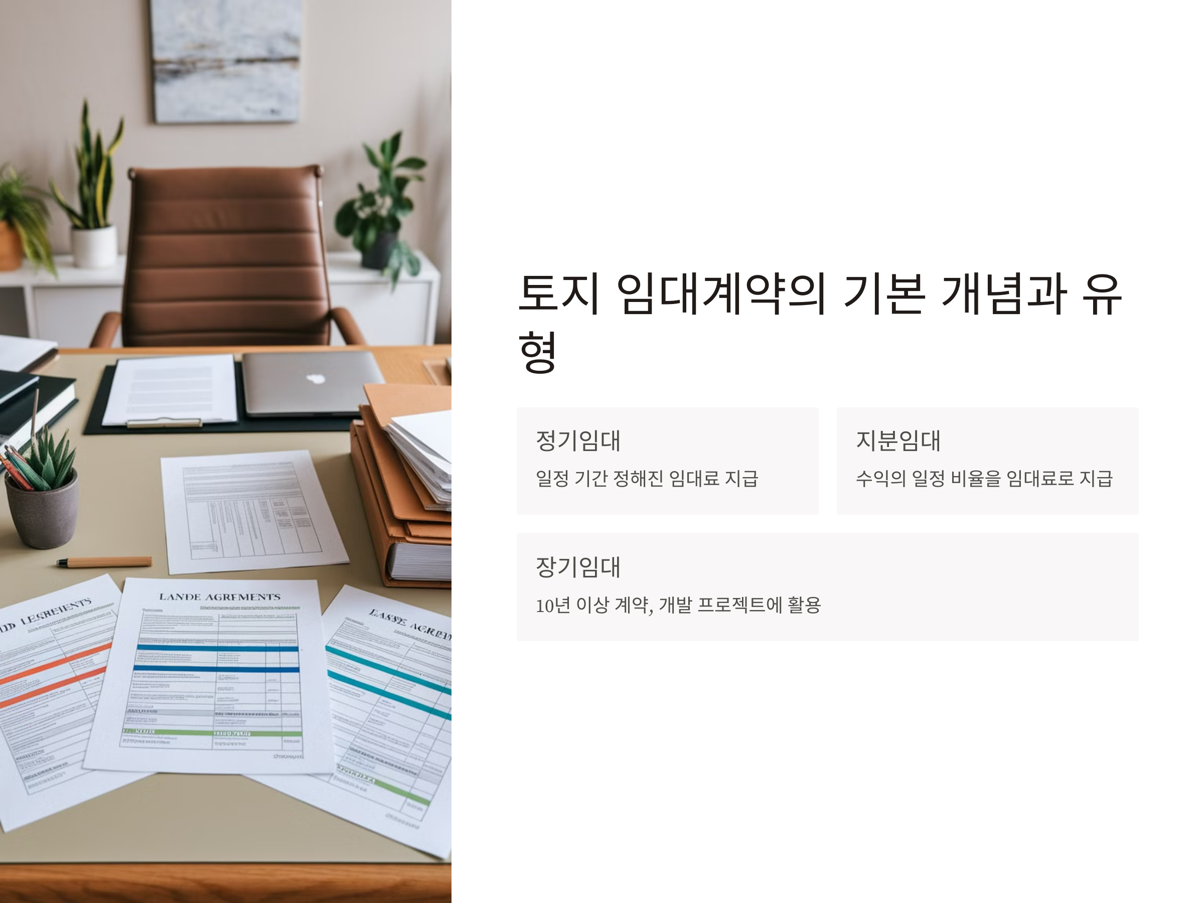 토지 임대계약은 토지를 일정 기간 동안 빌려 사용하고 이에 대한 대가를 지급하는 계약을 의미합니다. 이는 법적으로 확실한 권리와 의무가 설정되는 계약이므로 임대인과 임차인의 이해관계를 명확히 하는 것이 중요합니다. 토지 임대는 크게 다음과 같은 유형으로 나뉩니다.