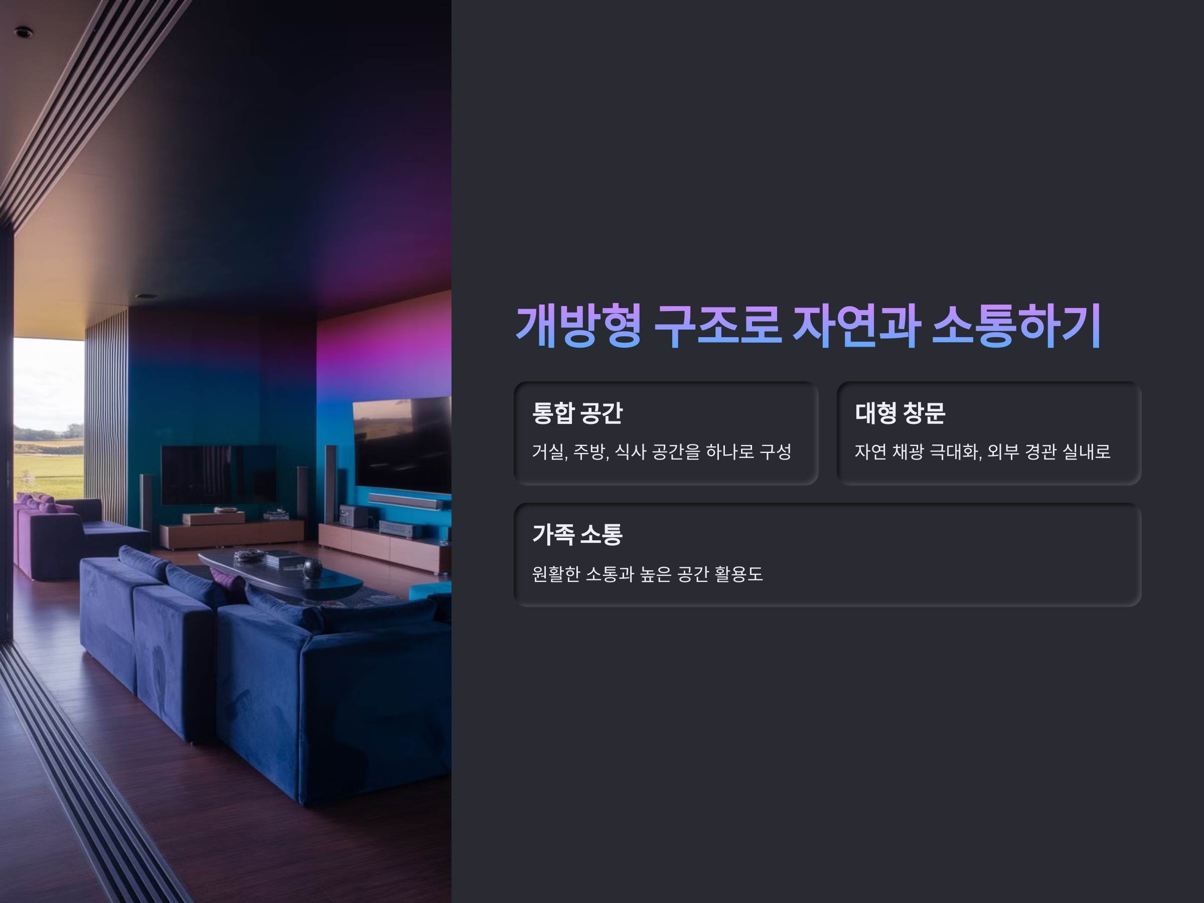 전원주택 거실 설계에서 가장 중요한 요소 중 하나는 개방형 구조입니다. 거실과 주방, 식사 공간을 하나의 큰 공간으로 구성하면 가족 간의 소통이 원활해지고, 공간 활용도가 높아집니다. 특히, 대형 창문이나 슬라이딩 도어를 통해 자연 채광을 극대화하고, 외부 경관을 실내로 끌어들일 수 있습니다. 이러한 설계는 거실을 더욱 넓고 밝게 만들어 주며, 자연과의 연결성을 강화합니다.