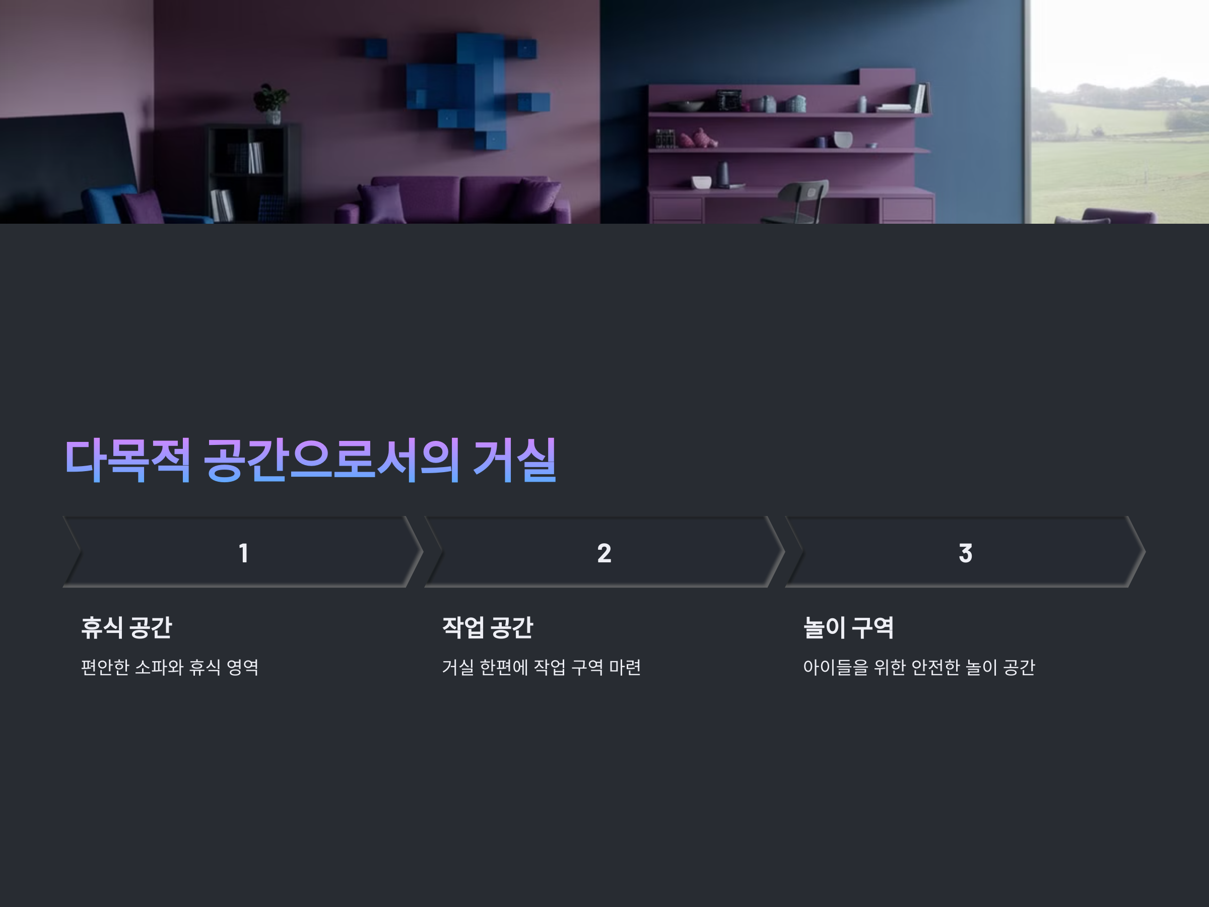 현대의 거실은 단순한 휴식 공간을 넘어 다양한 기능을 수행하는 다목적 공간으로 활용되고 있습니다. 예를 들어, 거실 한편에 작업 공간을 마련하거나, 아이들을 위한 놀이 구역을 조성할 수 있습니다. 이러한 다목적 공간 설계는 가족 구성원의 다양한 활동을 지원하며, 공간 활용도를 높입니다.