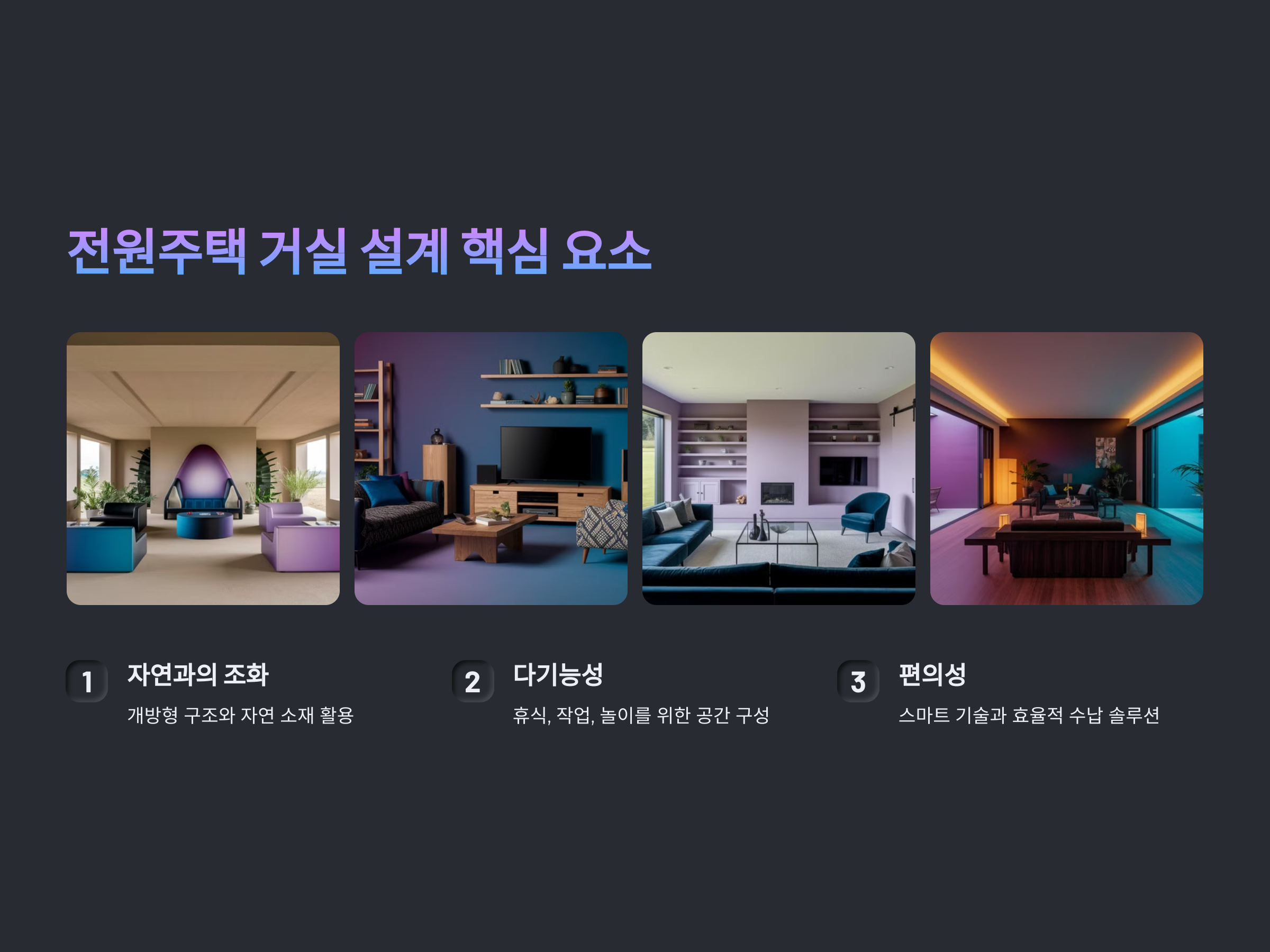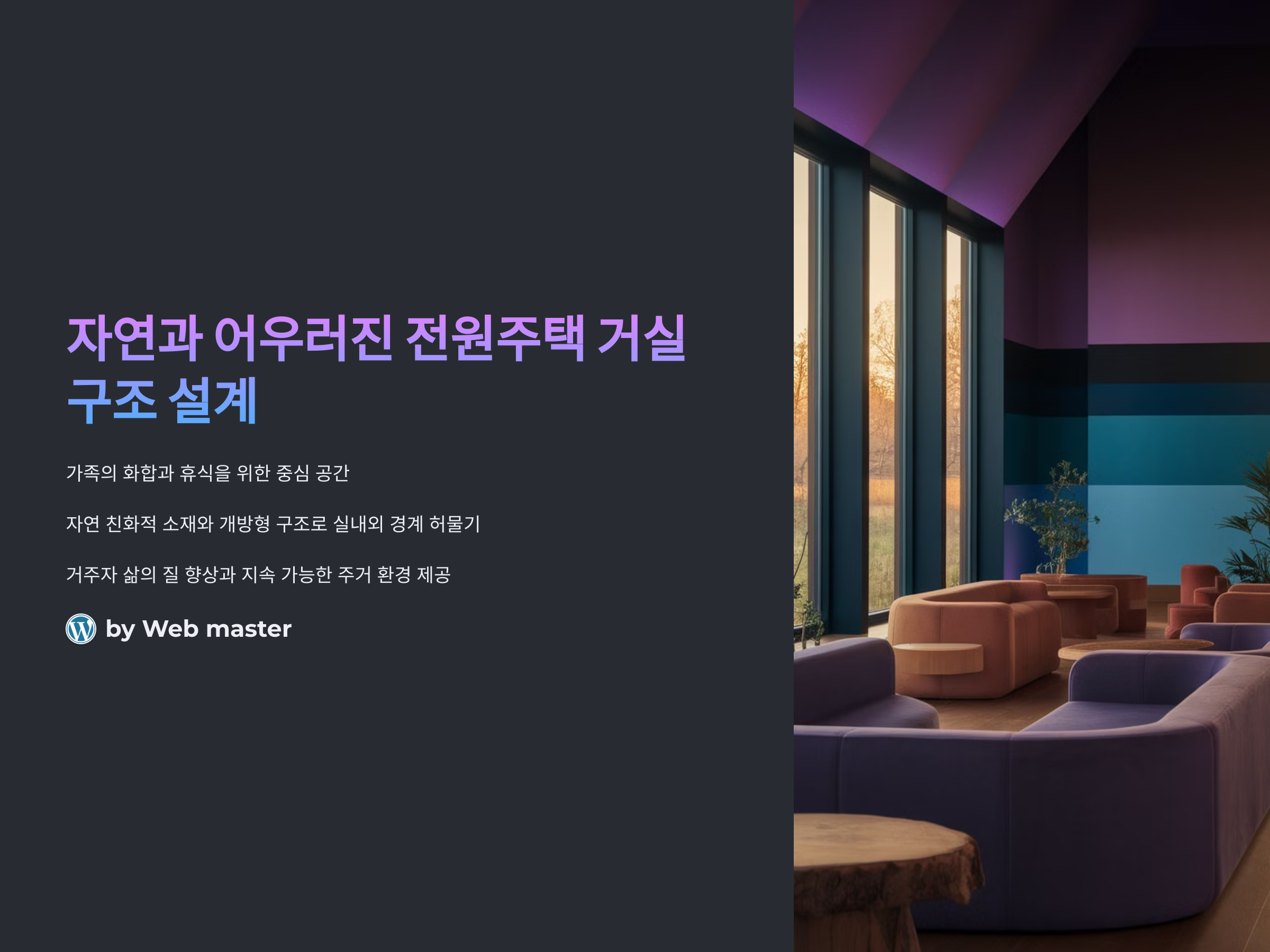 전원주택의 거실은 가족의 화합과 휴식을 위한 중심 공간으로, 자연과 조화를 이루는 설계가 중요합니다. 최근에는 자연 친화적인 소재와 개방형 구조를 활용하여 실내외의 경계를 허무는 디자인이 주목받고 있습니다. 이러한 설계는 거주자의 삶의 질을 향상시키며, 지속 가능한 주거 환경을 제공합니다.
