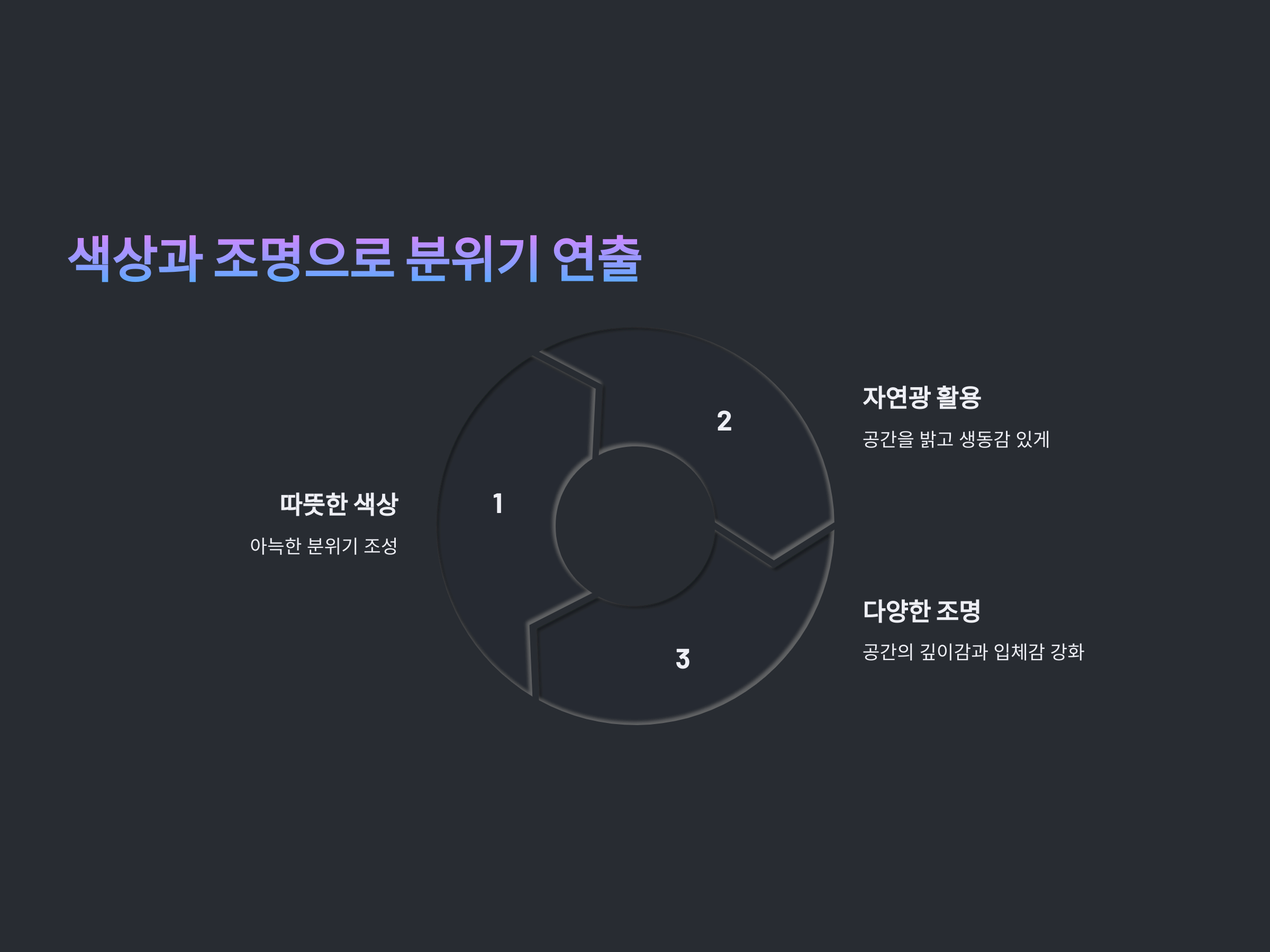 거실의 분위기는 색상과 조명에 크게 영향을 받습니다. 따뜻한 톤의 색상을 사용하면 아늑한 분위기를 조성할 수 있으며, 자연광을 최대한 활용하는 조명 설계는 공간을 밝고 생동감 있게 만들어 줍니다. 또한, 다양한 조명 기구를 활용하여 공간의 깊이감과 입체감을 더할 수 있습니다.
