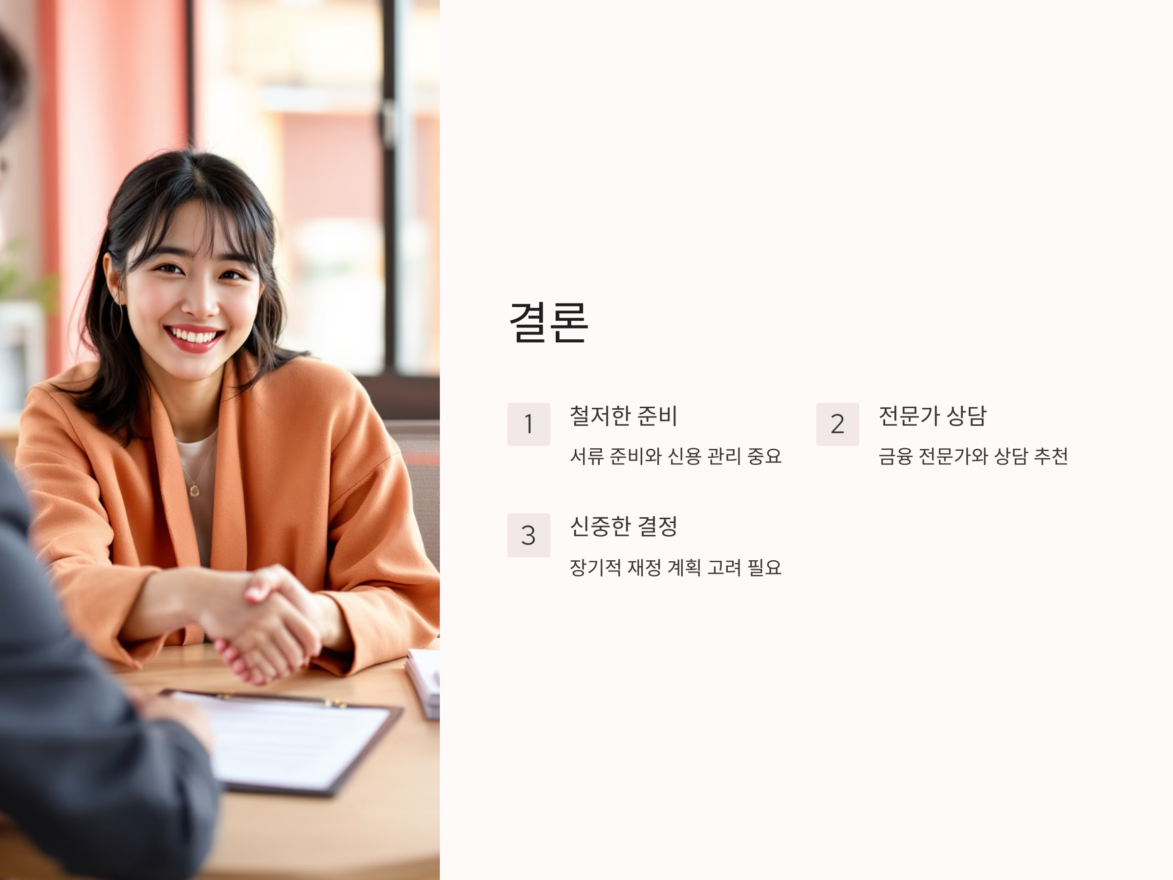 - 신용 관리: 평소에 신용 점수를 관리하여 대출 심사 시 불이익을 받지 않도록 해야 합니다.