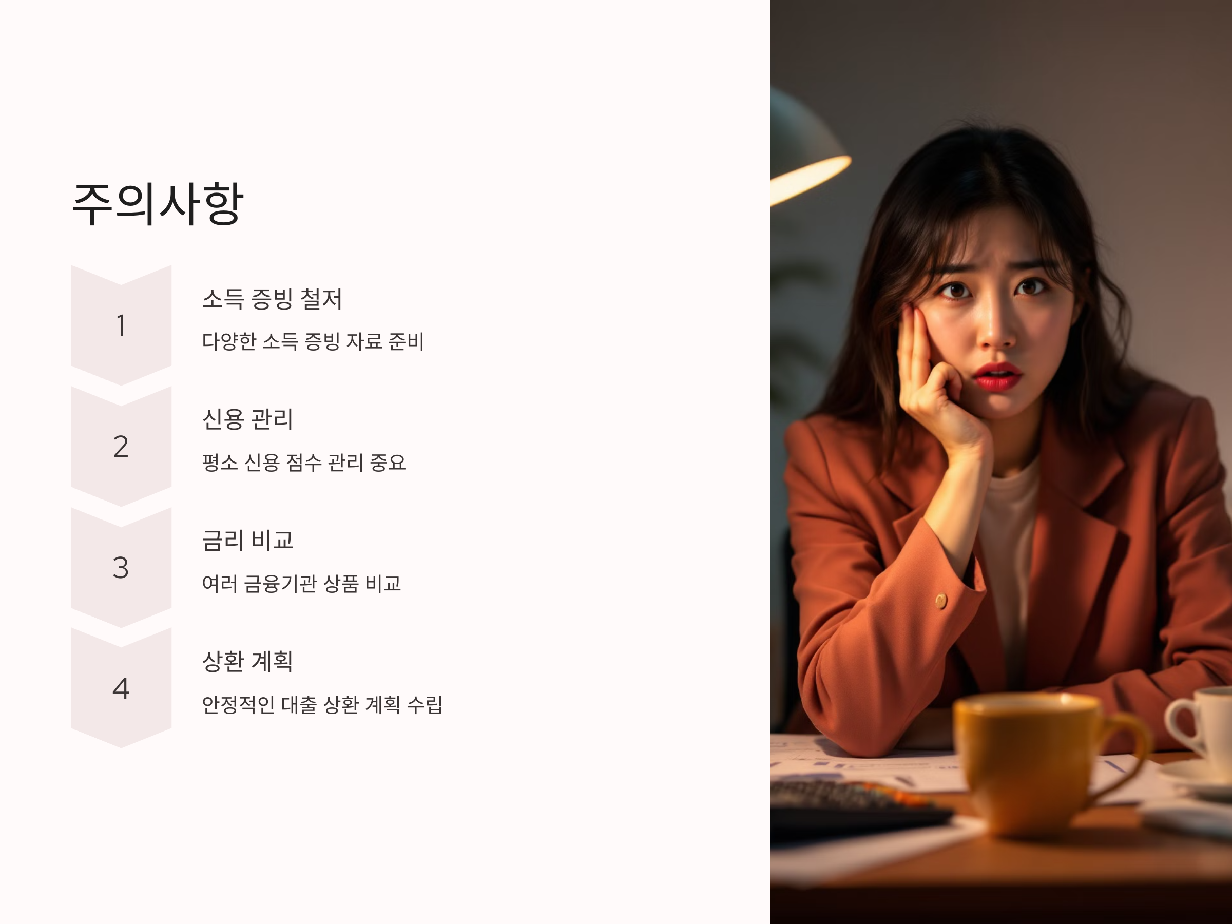 - 소득 증빙 철저: 소득이 불규칙한 자영업자의 경우, 가능한 한 많은 소득 증빙 자료를 준비하여 신뢰성을 높여야 합니다.