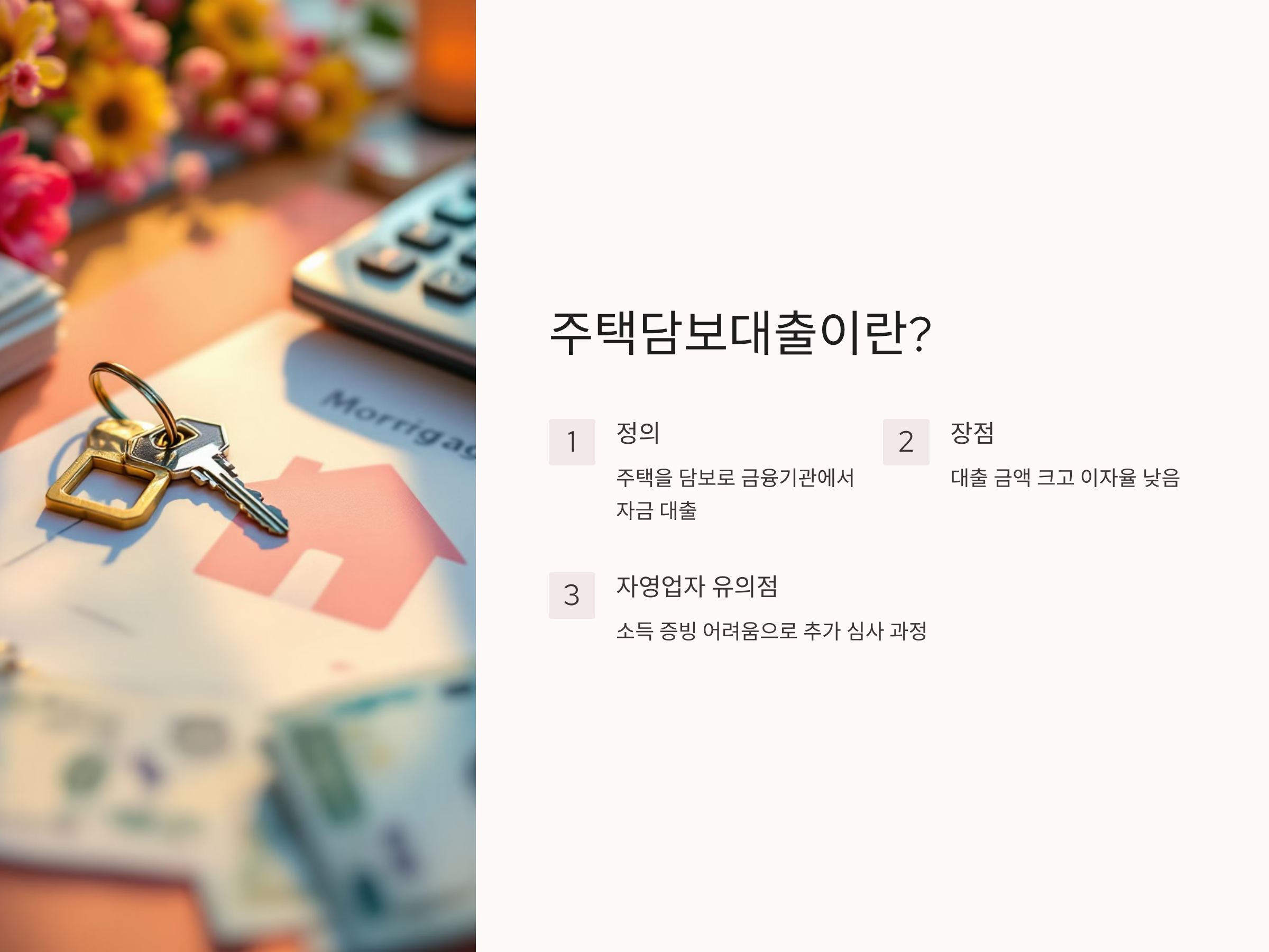 주택담보대출은 소유하고 있는 주택을 담보로 금융기관에서 자금을 대출받는 형태의 금융 상품입니다. 일반적으로 대출 금액이 크고 이자율이 낮아, 자영업자들에게도 유용한 자금 조달 방법이 될 수 있습니다. 그러나 자영업자의 경우, 소득이 일정하지 않아 대출 심사 시 추가적인 서류 제출과 심사 과정을 거칠 수 있습니다.