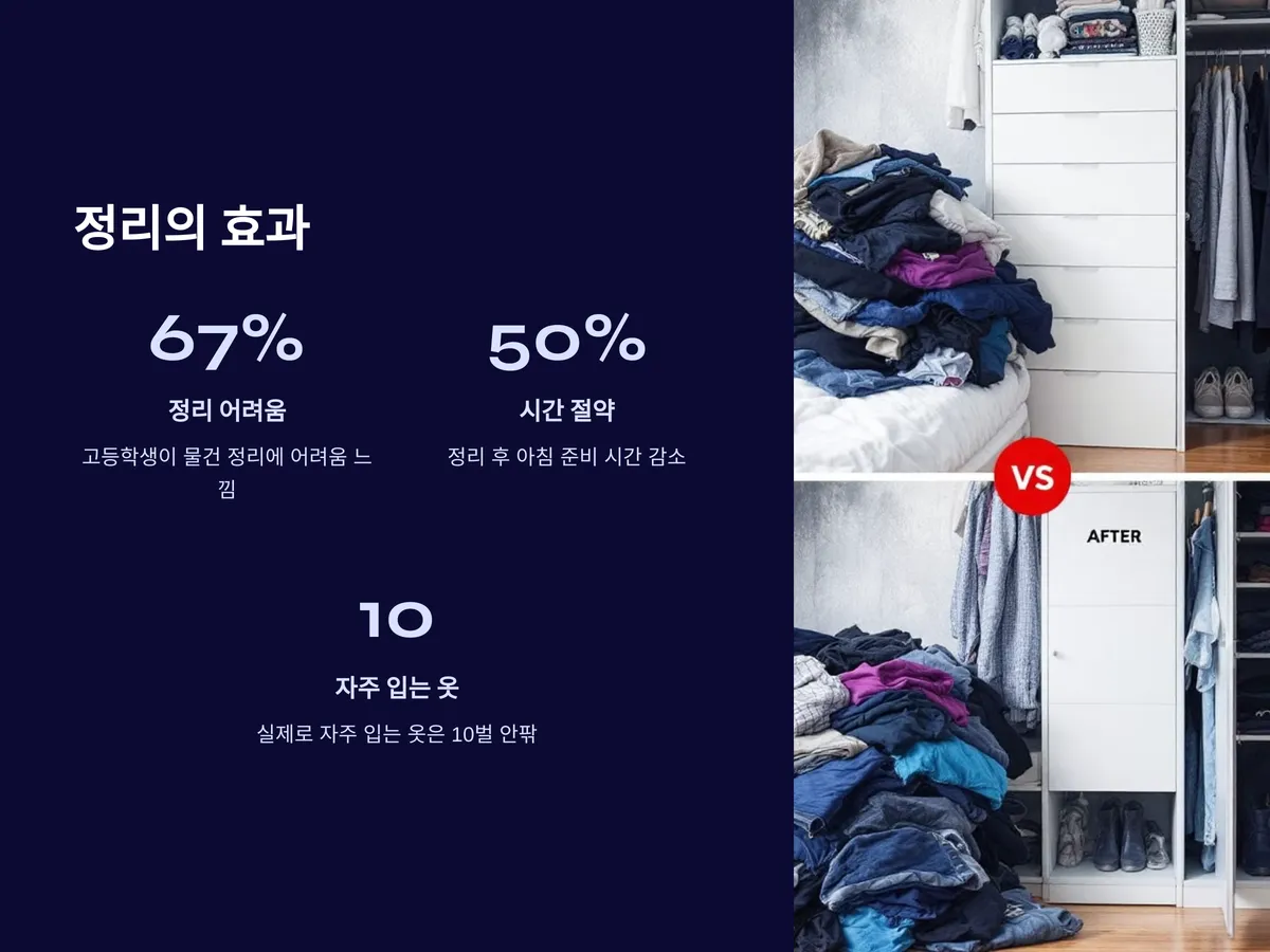 고등학생의 옷 정리는 생각보다 단순하게 접근하는 것이 핵심입니다. 가장 먼저 해야 할 일은 현재 옷장에서 ‘실제로 입고 있는 옷’만 남기는 것입니다. 옷이 많아도, 자주 입는 옷은 10벌 안팎이라는 통계처럼, 입지 않는 옷을 과감히 제외해야 진짜 정리가 시작됩니다.