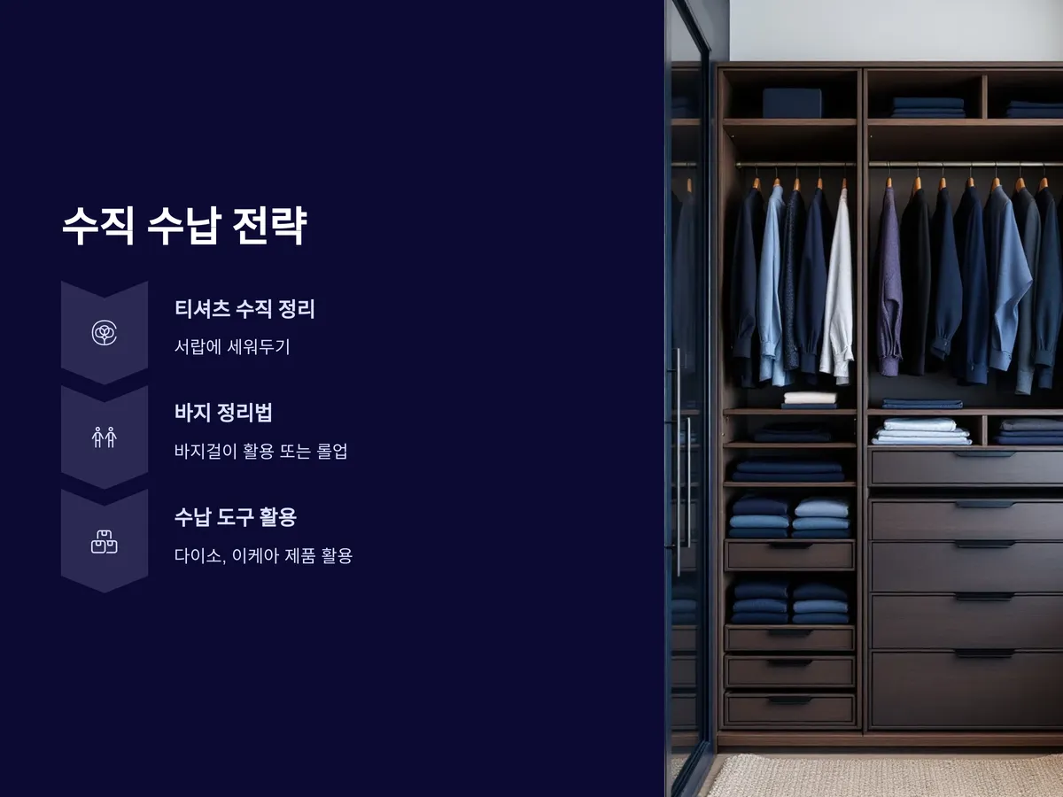 특히 셔츠나 티셔츠는 서랍형 보관함이나 박스에 수직으로 정리하면 한눈에 어떤 옷이 있는지 확인할 수 있어 아침 준비 시간이 줄어듭니다. 팬츠는 바지걸이를 이용해 여러 개를 겹치지 않게 걸거나, 롤업해서 바구니에 수직으로 세워두는 것도 좋은 방법입니다. 이 전략은 IKEA나 무인양품, 다이소 등에서 판매하는 저렴한 수납 도구를 활용하면 누구나 쉽게 구현할 수 있어 인기가 높습니다.