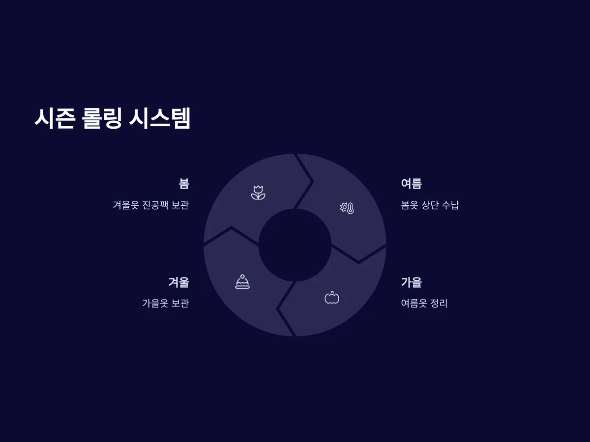 계절이 바뀌면 새로운 옷이 필요하지만 기존 옷들은 그대로 남아있기 때문에 옷장이 가득 차기 쉽습니다. 이때 필요한 것이 바로 ‘시즌 롤링 시스템’입니다. 계절이 바뀔 때마다 그 계절에 입지 않는 옷은 진공팩이나 수납 박스에 넣어 상단 보관 공간으로 올리는 방식입니다.