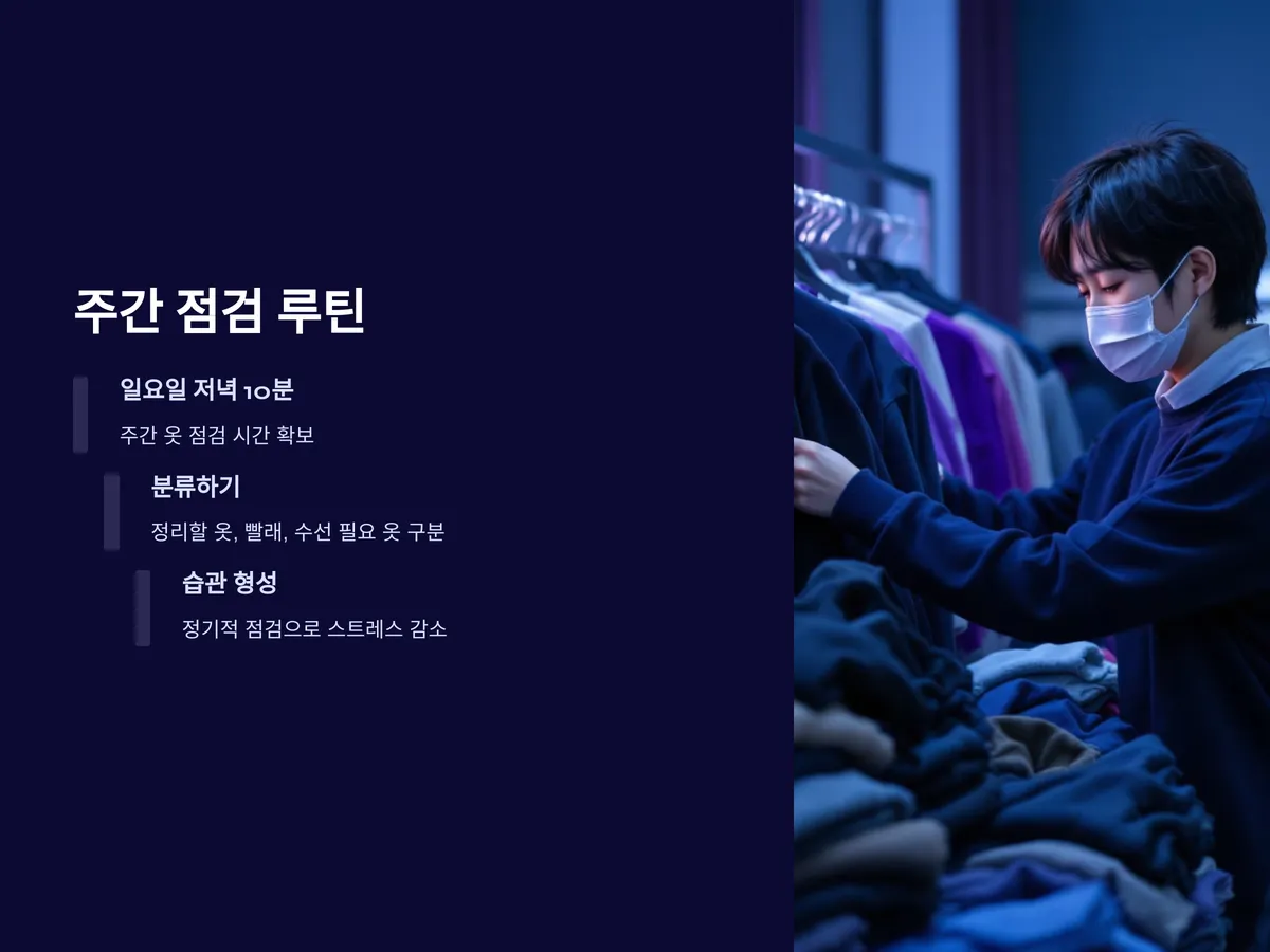 옷장 정리는 일회성으로 끝나면 다시 원래대로 돌아가기 마련입니다. 정리 습관을 만들기 위해선 주 1회, 단 10분만 투자하는 점검 루틴을 만드는 것이 중요합니다.