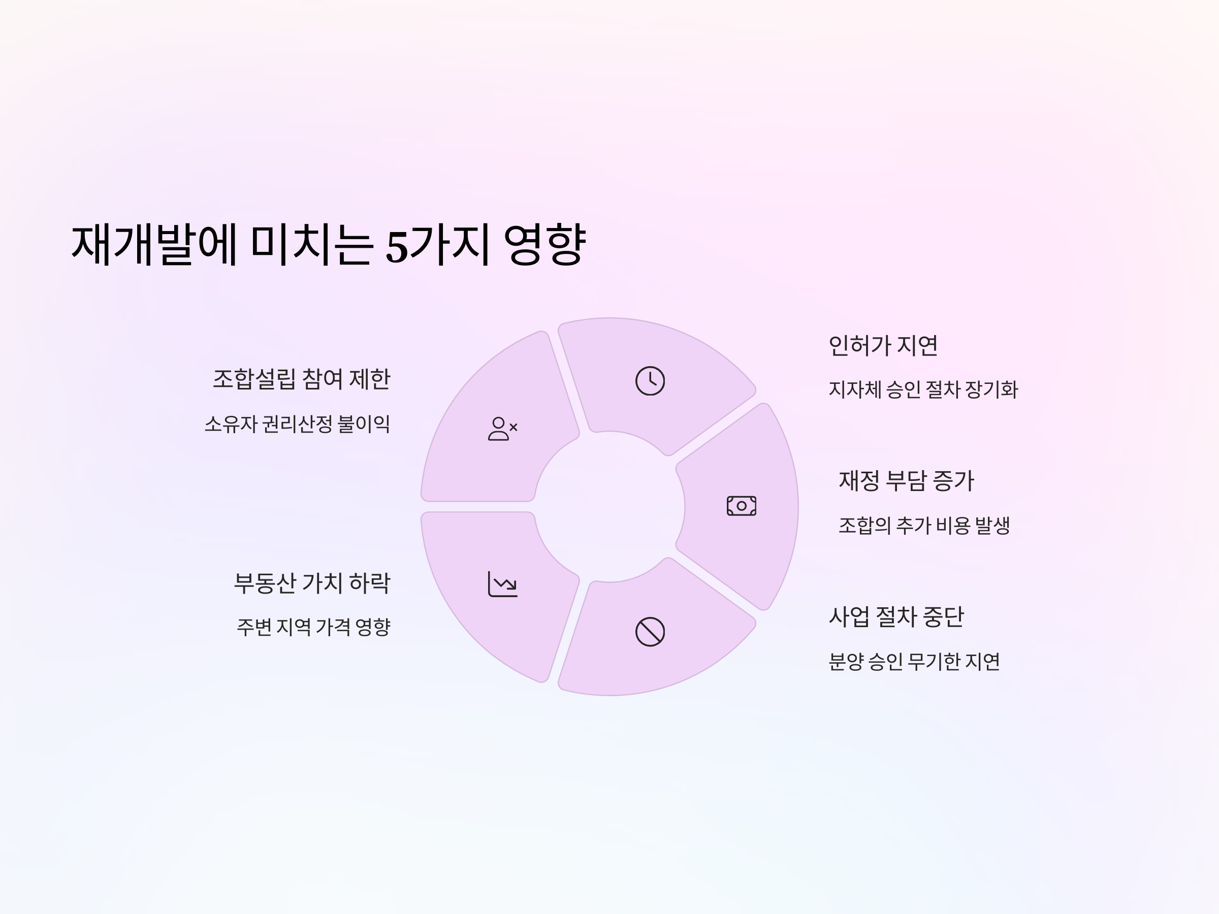 불법건축물이 재개발사업에 미치는 영향은 단순한 속도 저하에 그치지 않습니다. 첫째, 해당 건축물의 소유자는 조합설립에 참여할 수 없거나 권리산정에서 불이익을 받을 수 있습니다. 둘째, 인허가 과정에서 지자체의 정비계획 승인 지연이 발생하며 이는 사업 전반에 큰 지장을 초래합니다. 셋째, 조합의 재정적 부담이 증가할 수 있으며, 넷째, 분양 승인 및 후속 사업 절차가 무기한 지연될 수 있습니다. 다섯째, 주변 부동산 가치 하락의 원인이 되기도 합니다.