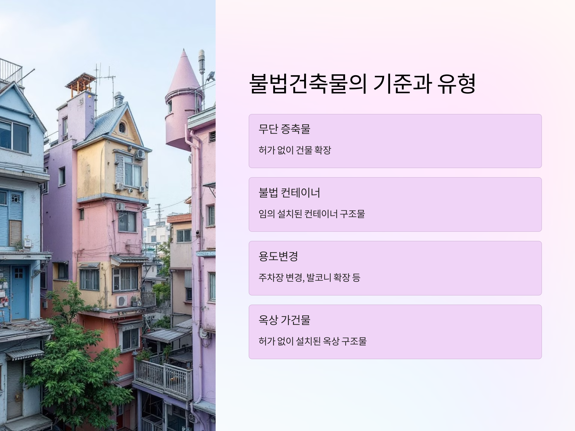 불법건축물은 일반적으로 ‘건축법’상 허가 없이 건축된 구조물을 의미하며, 이에는 무단 증축, 개축, 용도변경, 불법 컨테이너, 옥상 가건물, 지하 무단공사 등이 포함됩니다. 특히 도시형 생활주택이나 다세대주택의 경우, 발코니 확장이나 주차장 공간 변경 등 일견 사소해 보이는 변경도 불법건축물로 분류될 수 있어 주의가 필요합니다.