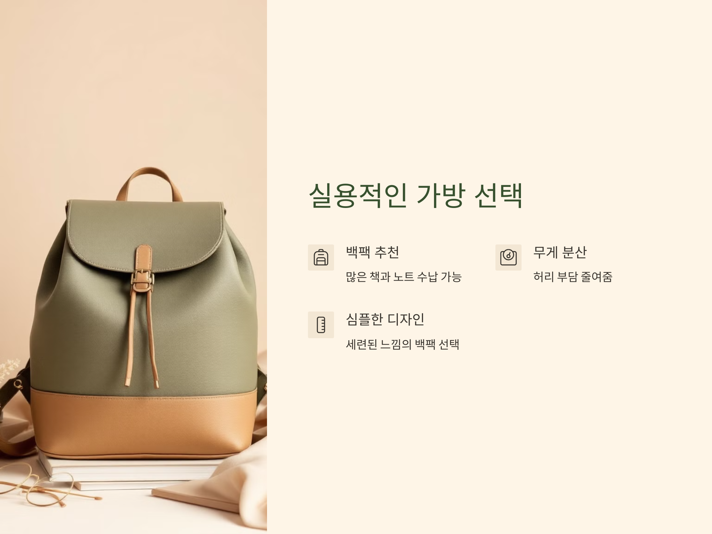 재수생에게 필요한 첫 번째 아이템은 바로 가방입니다. 하루 종일 책을 들고 다니며 학원과 도서관을 오가는 재수생에게 가방은 실용성뿐만 아니라 스타일을 강조할 수 있는 중요한 액세서리입니다. 특히, 편안하고 다용도로 활용할 수 있는 백팩이나 메신저백이 좋습니다. 백팩은 많은 책과 노트를 수납할 수 있으며, 무게를 고르게 분산시켜 허리에 부담을 줄여줍니다.