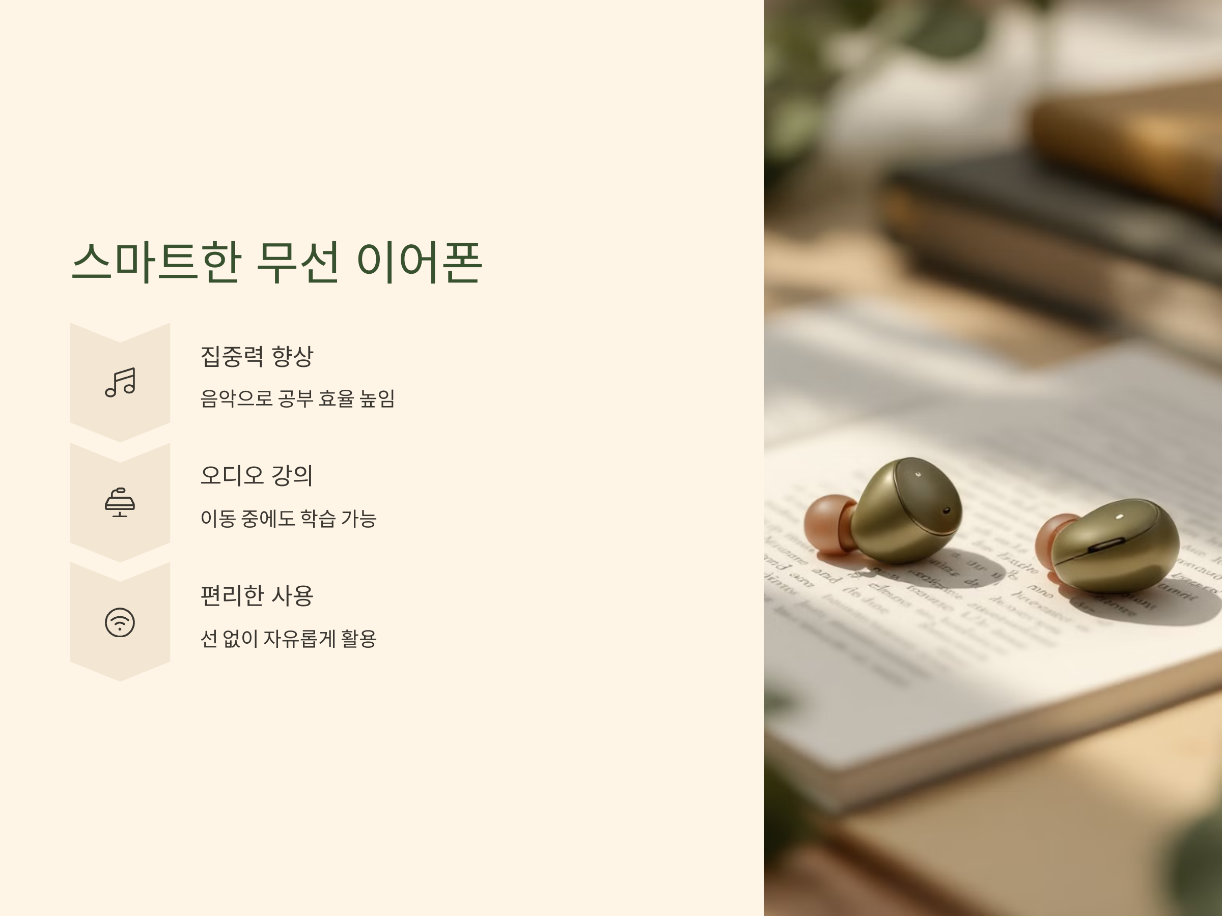 학습 중이나 이동 중에 음악을 듣거나, 오디오 강의를 들을 수 있는 스마트한 무선 이어폰은 재수생에게 필수적인 액세서리 중 하나입니다. 집중력을 높여줄 수 있는 음악이나 강의는 지루할 수 있는 공부 시간을 더욱 효율적으로 만들어 줄 수 있습니다. 특히, 무선 이어폰은 복잡한 선이 없어서 더 편리하게 사용할 수 있습니다.