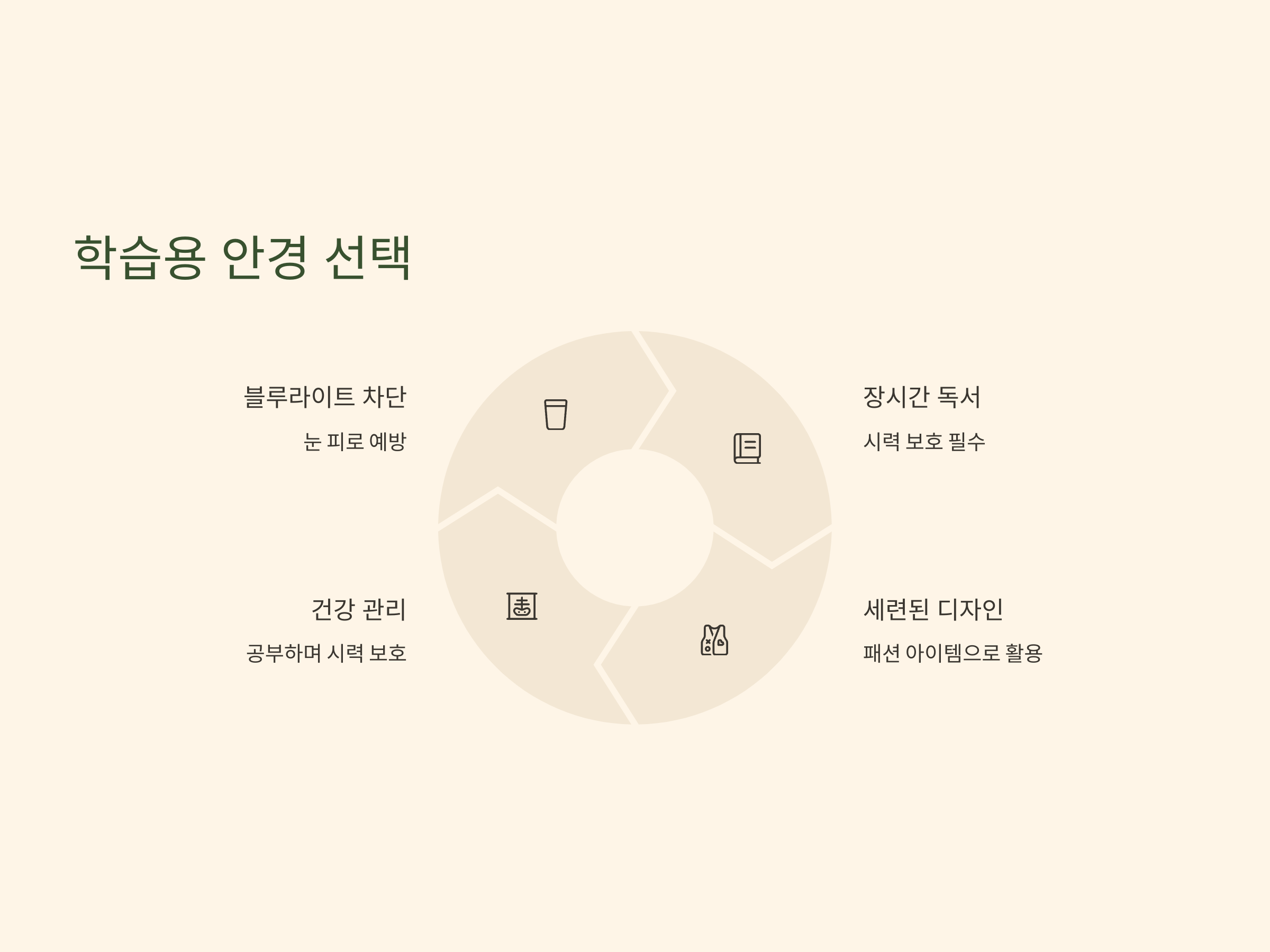 깔끔하고 세련된 디자인의 안경을 선택하면 패션을 완성하는 액세서리로 활용할 수 있으며, 필요시 시력에 맞는 렌즈를 추가해 시력을 보호할 수 있습니다. 장시간 공부와 학습에 집중하면서 스타일도 챙기고 건강도 신경 쓸 수 있는 아이템입니다.