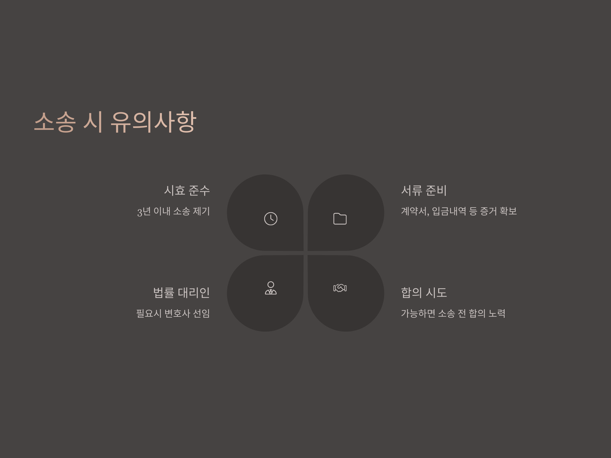 셋째, 소송을 진행하기 전에 임대인과의 원만한 해결을 시도할 필요도 있습니다. 법적 절차는 시간이 많이 걸리고, 비용이 발생할 수 있기 때문에 가능하면 합의 후 해결하는 것이 좋습니다. 만약 합의가 어렵다면, 소송을 통해 법적 권리를 확실하게 주장할 수 있습니다.