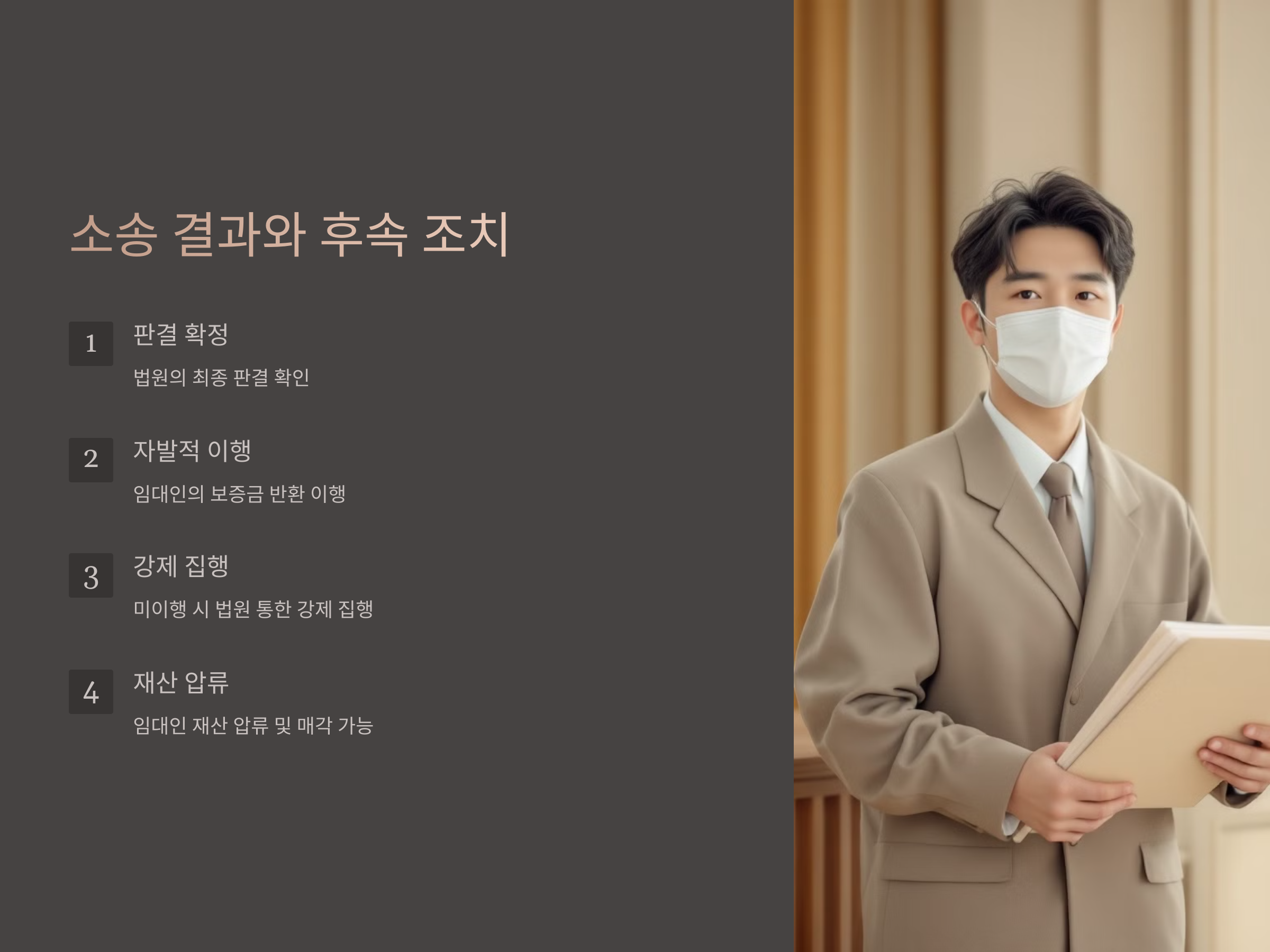 소송 결과에 따라 임차인은 정당하게 보증금을 반환받을 수 있으며, 임대인은 법적 책임을 지게 됩니다. 이 과정을 통해 임차인은 법적으로 보호받고, 임대인은 반환의 의무를 이행해야 합니다.