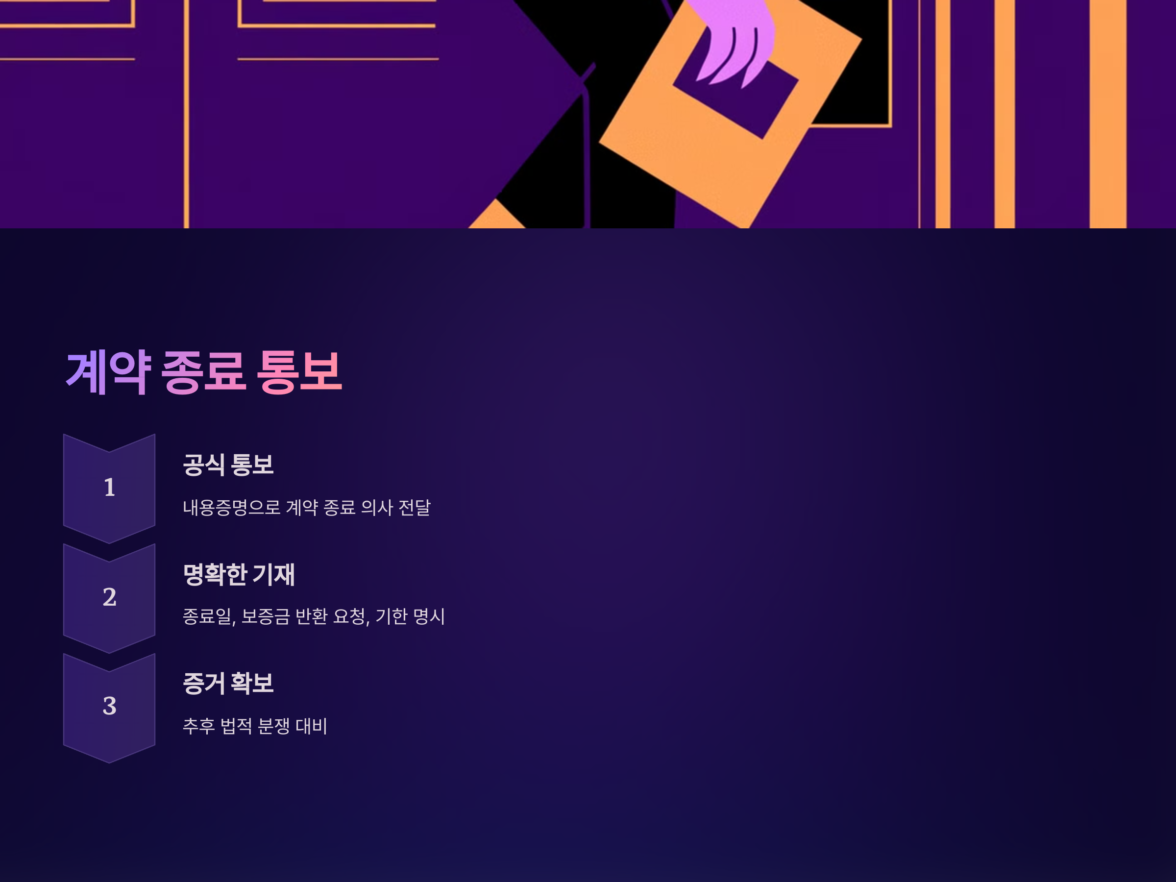 계약 종료일이 다가오면, 임대인에게 계약 종료 의사를 공식적으로 통보해야 합니다. 이때 내용증명을 활용하여 서면으로 통보하는 것이 바람직합니다. 내용증명에는 계약 종료일, 보증금 반환 요청, 반환 기한 등을 명확히 기재하여 추후 법적 분쟁 시 증거로 활용할 수 있습니다. 이러한 공식적인 절차를 통해 임대인에게 보증금 반환의 중요성을 인지시킬 수 있습니다.
