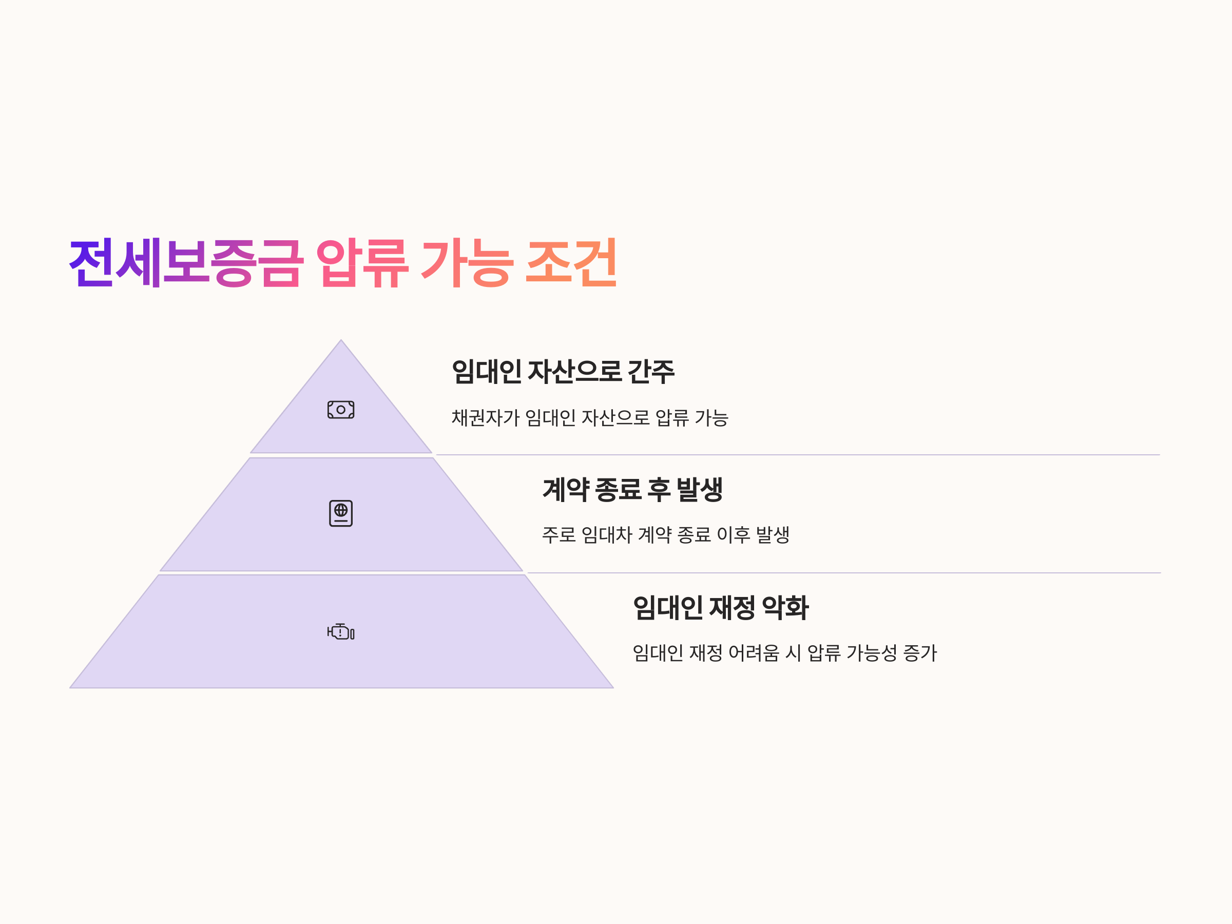 전세보증금이 압류될 수 있는 조건은 임대인의 채권 상황에 따라 달라집니다. 임대인이 개인적으로 지고 있는 채무가 많아지면, 그 채권자들이 법적 절차를 통해 임대인의 자산을 압류하려 할 수 있습니다. 이때 전세보증금도 임대인이 보유한 자산으로 간주되어 압류 대상이 될 수 있습니다.