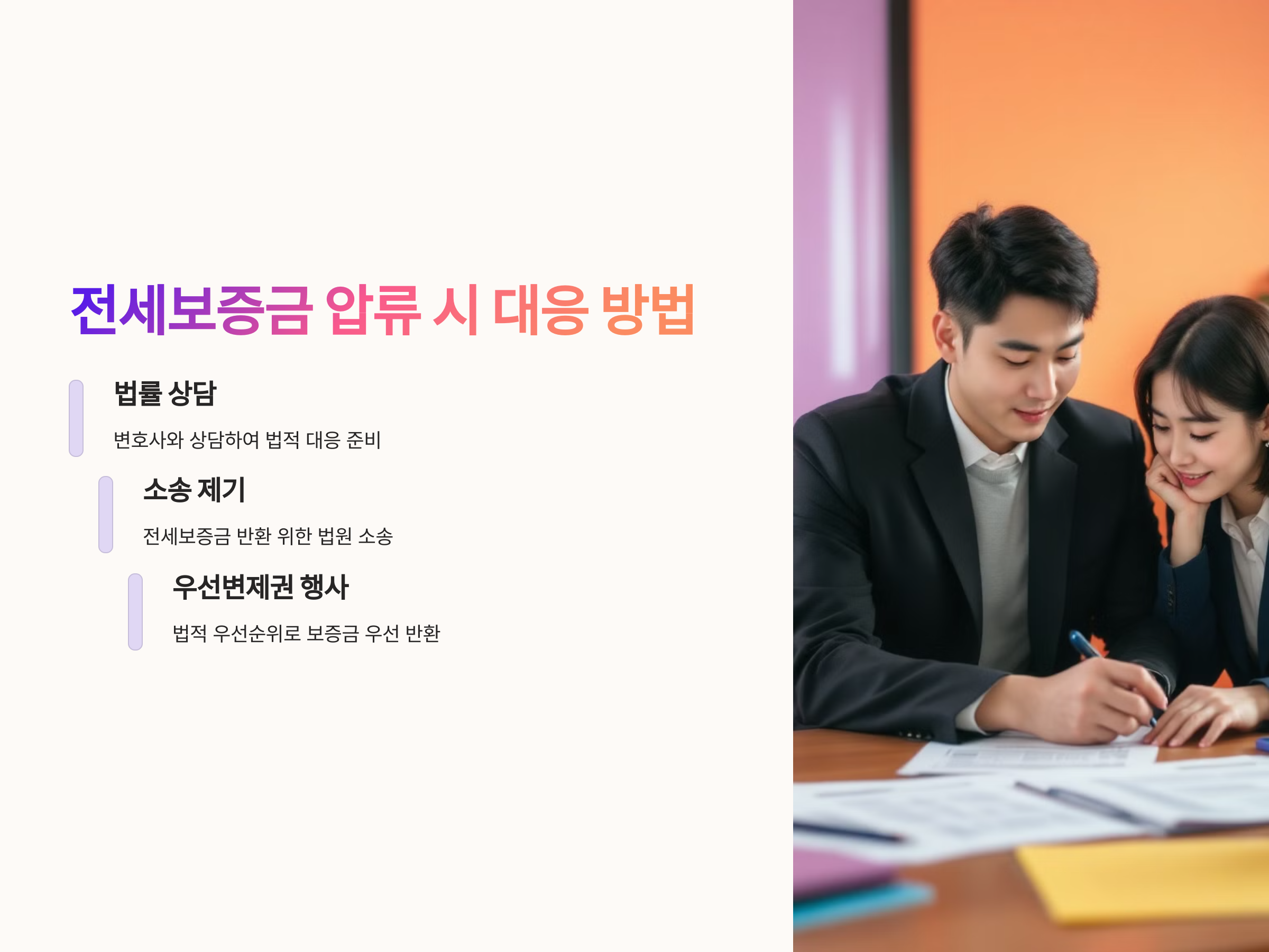 만약 전세보증금이 압류되는 상황에 처한 경우, 임차인은 어떻게 대응해야 할까요? 먼저, 임차인은 법적 절차를 거쳐 전세보증금을 보호받을 수 있는 방법을 모색해야 합니다. 가장 먼저 해야 할 일은 변호사와 상담하여 법적 대응을 준비하는 것입니다.