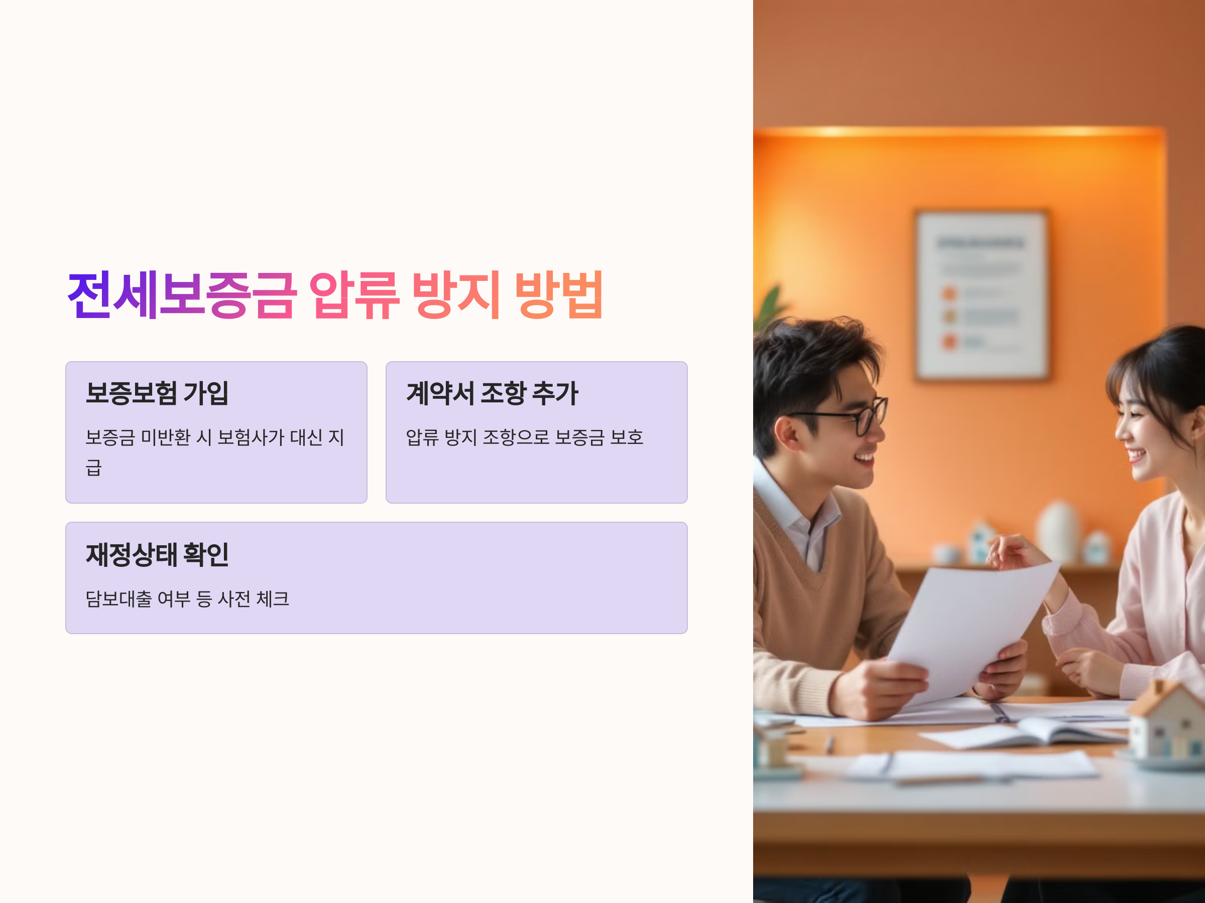 - 보증보험 가입: 전세보증금을 보호하는 가장 확실한 방법은 보증보험에 가입하는 것입니다. 이는 전세보증금을 반환받지 못하는 상황에서 임차인을 보호할 수 있습니다.