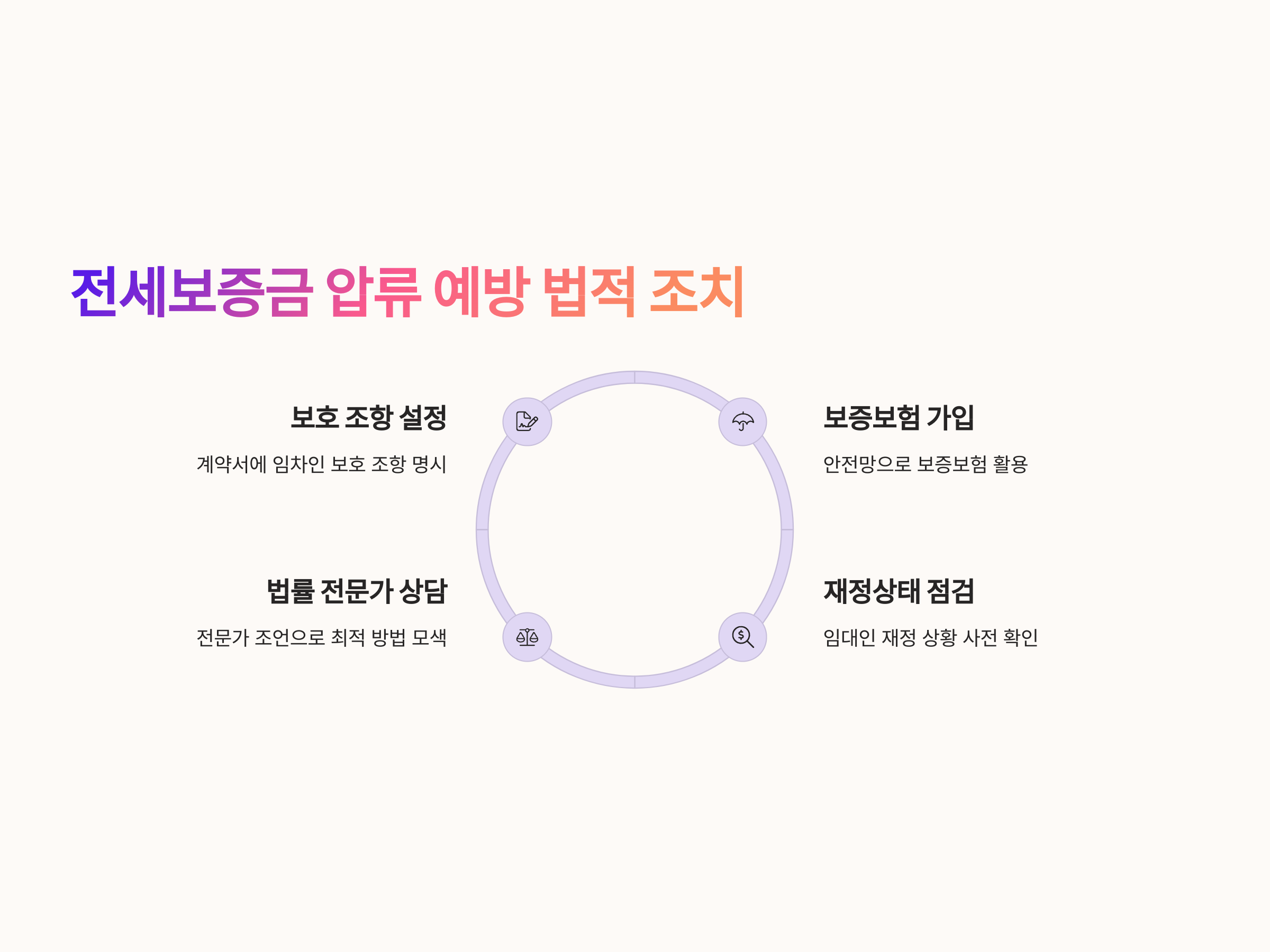 전세보증금이 압류되지 않도록 예방하려면 법적 조치를 미리 준비하는 것이 중요합니다. 계약서에 임차인 보호 조항을 명확히 설정하고, 보증보험에 가입하여 안전망을 마련하는 것이 좋습니다. 또한, 임대인의 재정 상태를 점검하고, 필요시 전문가의 법률 상담을 받는 것이 바람직합니다.