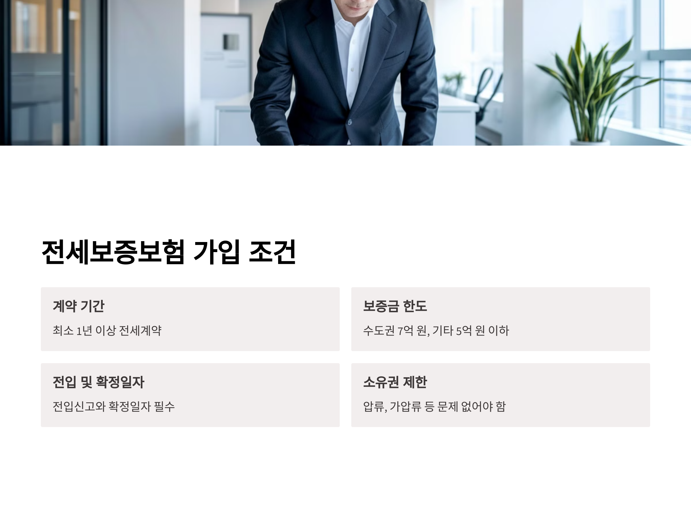 - 보증금 한도: 수도권은 7억 원 이하, 그 외 지역은 5억 원 이하의 보증금이어야 합니다.