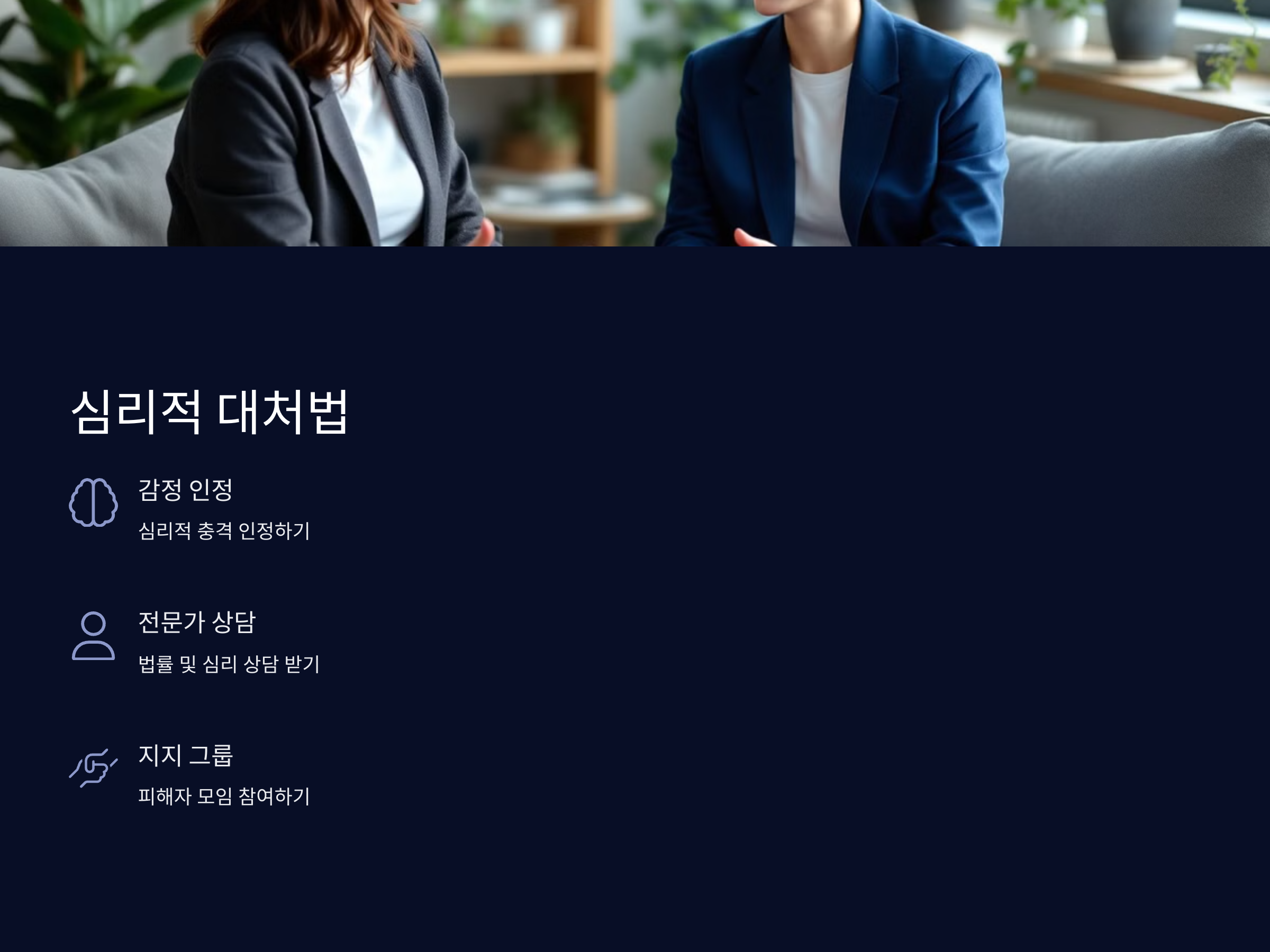 심리적인 고통을 덜기 위해서는 전문가와의 상담이 필요할 수 있습니다. 법률 상담을 받거나, 심리 상담을 통해 마음의 부담을 덜 수 있습니다.