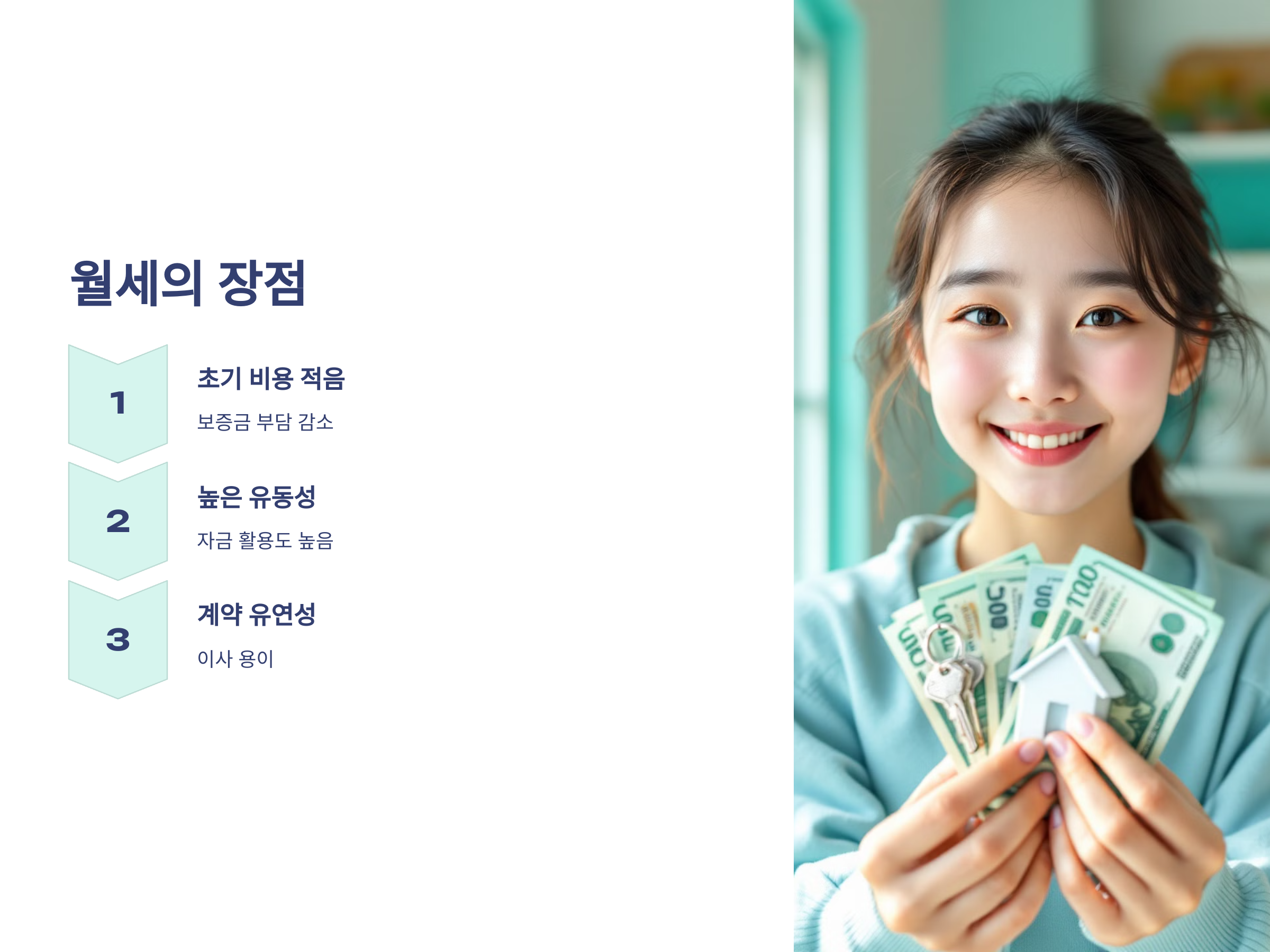 - 초기 비용 부담 적음: 전세에 비해 보증금이 적기 때문에 초기 비용이 덜 부담스럽습니다.