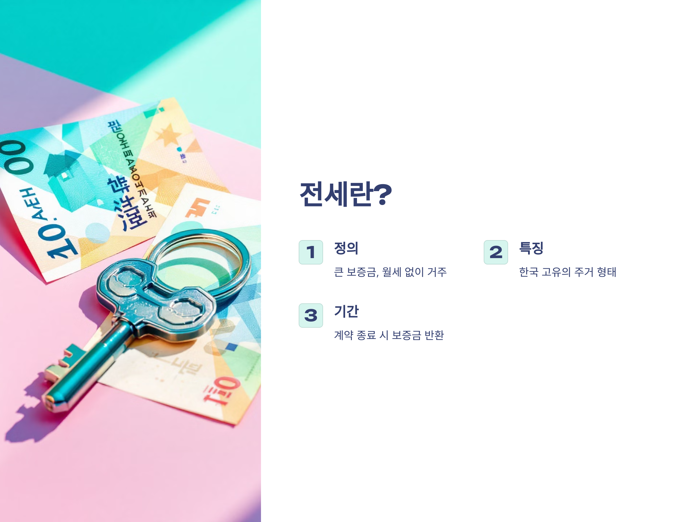전세는 임차인이 집값의 일정 비율에 해당하는 큰 금액의 보증금을 임대인에게 맡기고, 월세 없이 일정 기간 거주하는 방식입니다. 계약 기간이 종료되면 보증금을 전액 반환받습니다. 이러한 전세 제도는 한국에서 독특하게 발전한 주거 형태로, 다른 나라에서는 쉽게 찾아보기 어렵습니다.