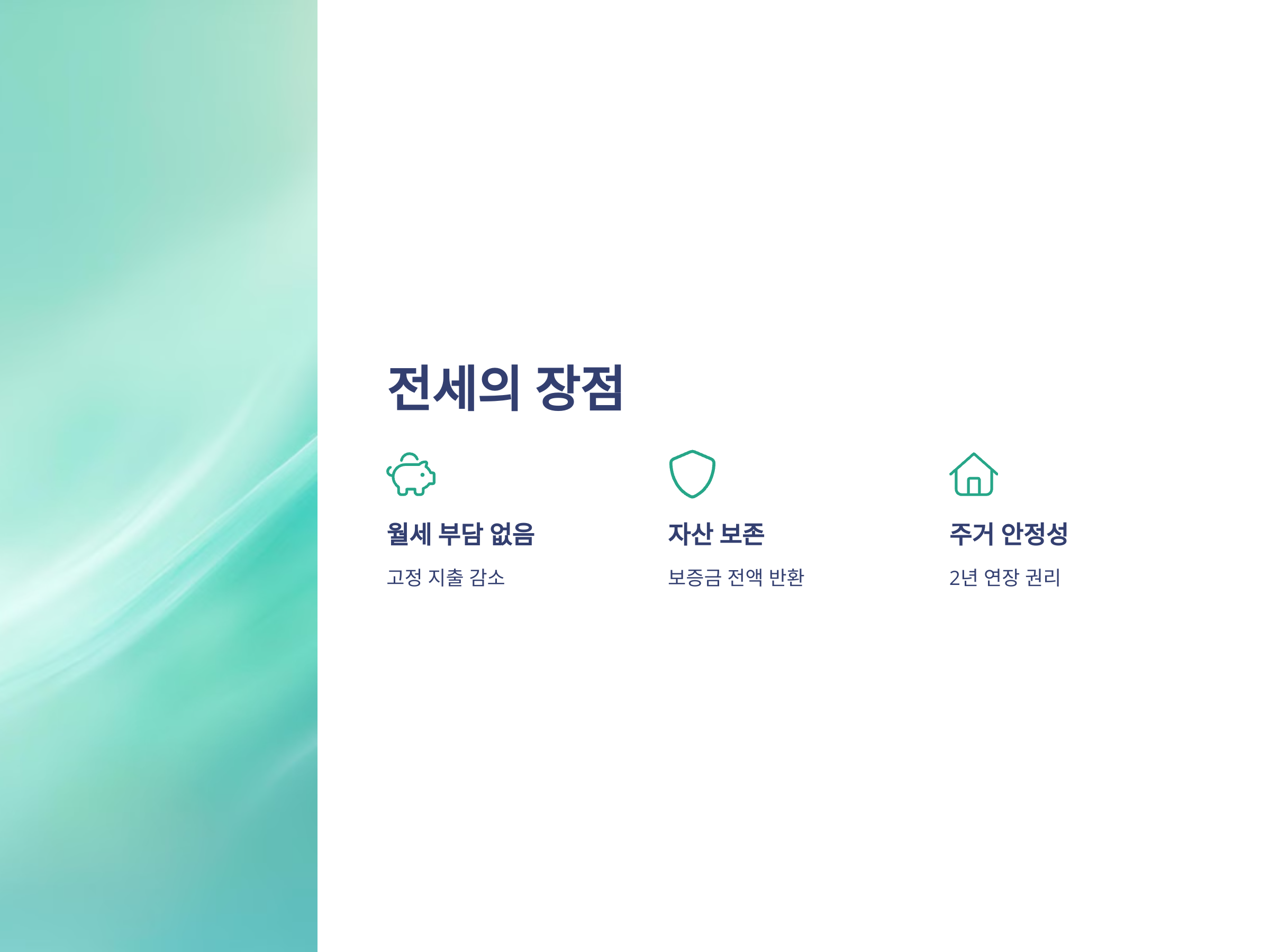 - 월세 부담 없음: 전세는 계약 기간 동안 추가적인 월세 비용이 없으므로 고정 지출이 줄어듭니다. 이는 특히 고정 소득이 적거나 다른 자산 운용 계획이 있는 사람들에게 유리합니다.