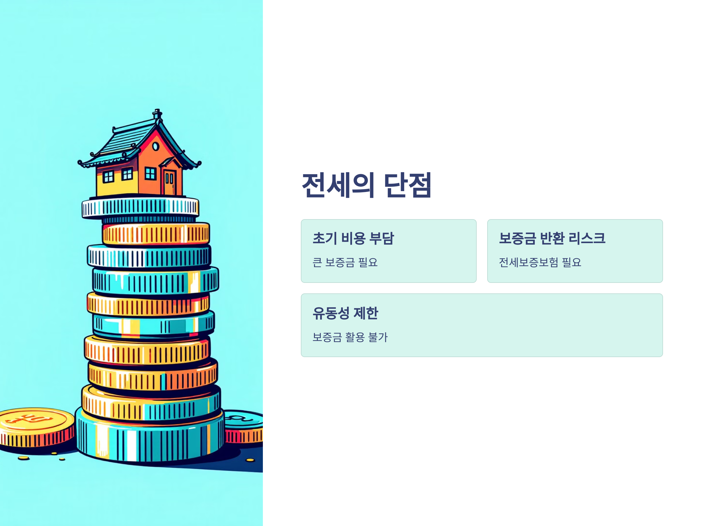 - 유동성 제한: 보증금으로 묶인 돈은 계약 기간 동안 다른 용도로 활용할 수 없습니다.