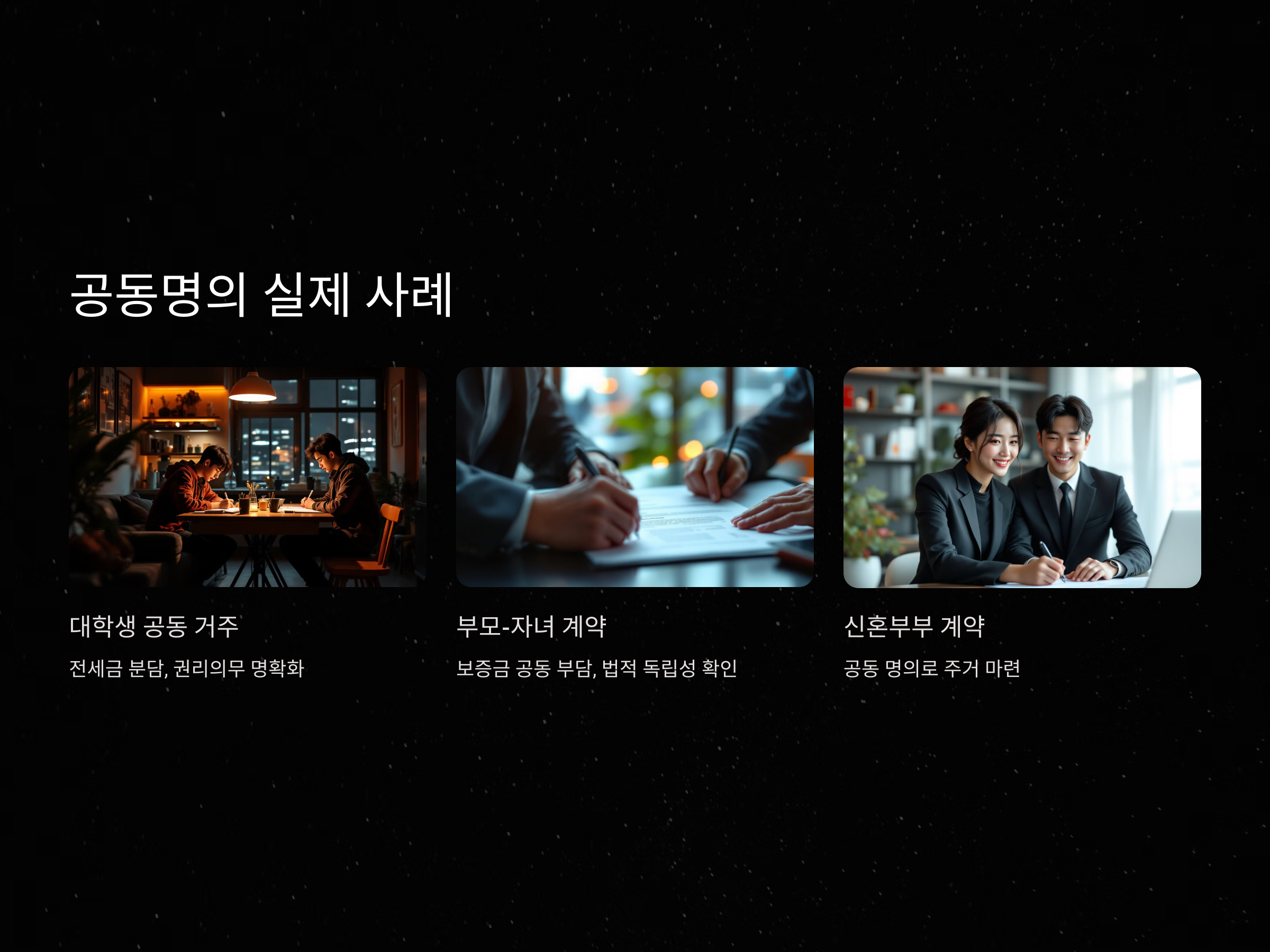 법적으로 전세 계약의 공동명의가 가능하다는 점은, 실제로 공동으로 거주할 의사를 가진 사람들 간에 계약을 체결할 때 인정되는 것입니다. 예를 들어, 부모와 자녀가 함께 전세 계약을 체결하는 경우, 전세 계약서에 부모와 자녀의 이름을 모두 기재하고, 이들이 모두 세입자로서 계약을 맺을 수 있습니다. 이 경우, 명확히 계약서에 모든 공동명의자의 권리와 의무를 기재하는 것이 중요합니다.