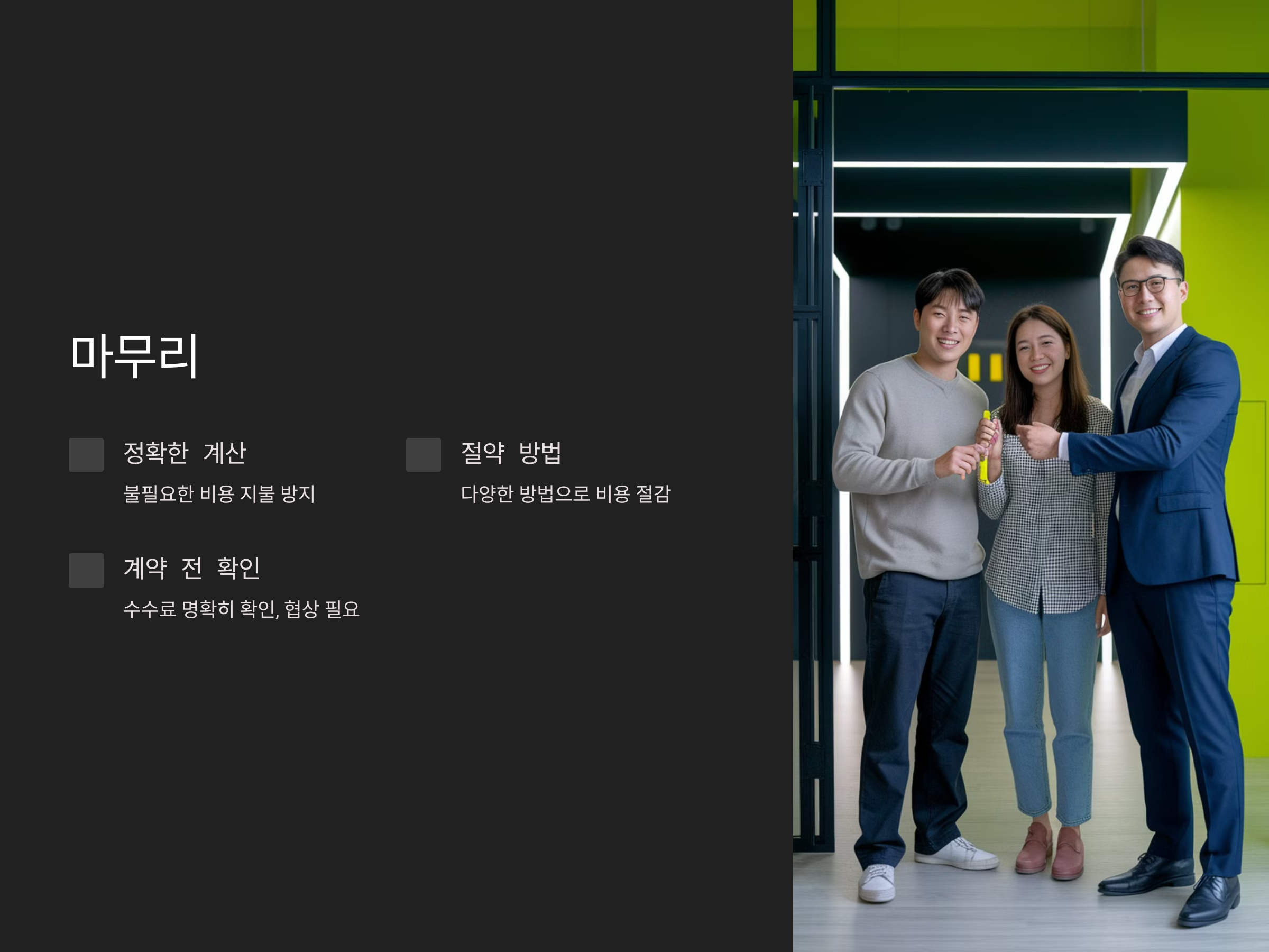 - 중개인과의 계약 시, 수수료를 명확히 확인하고, 나중에 과다한 수수료가 청구되지 않도록 주의해야 합니다.
