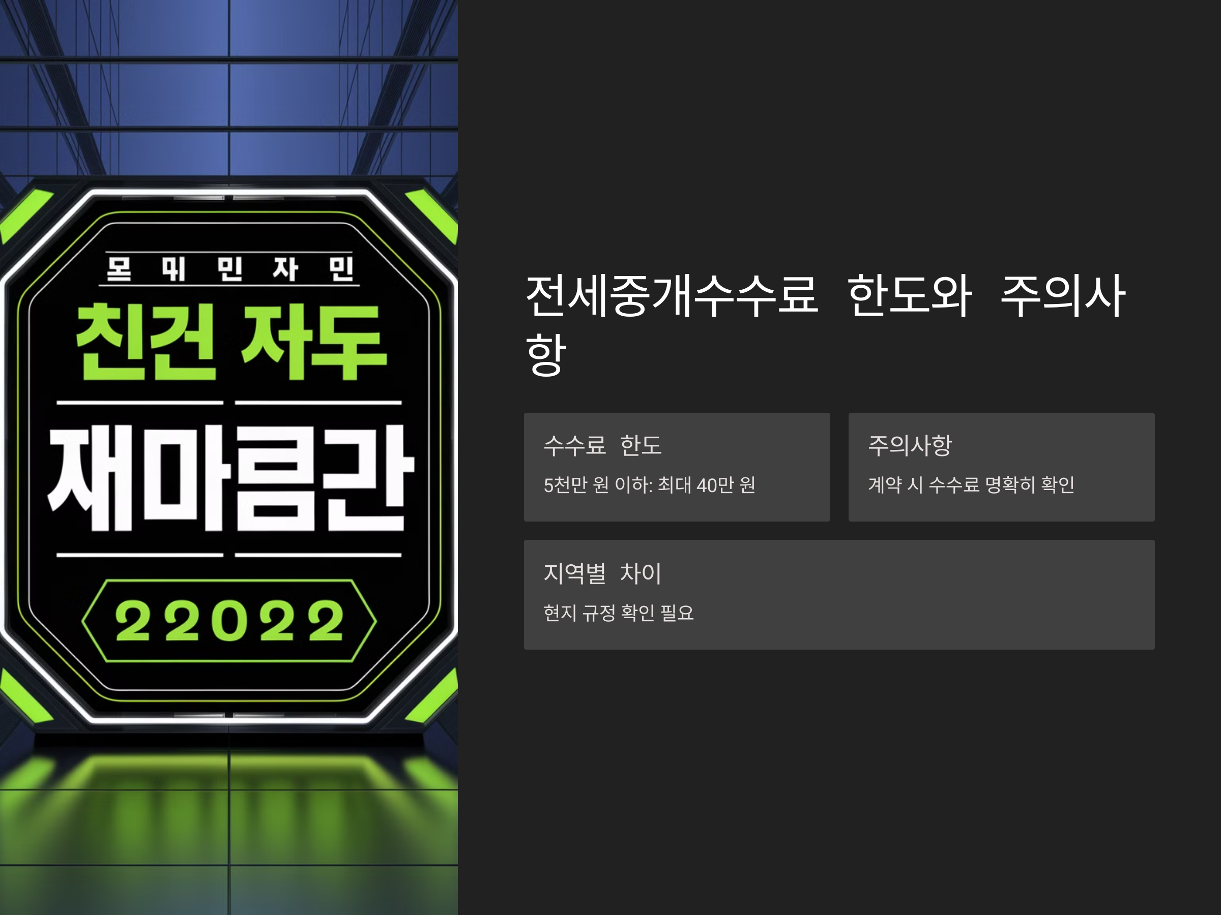- 예: 전세금 8,000만 원인 경우, 수수료는 8,000만 원 × 0.5% = 40만 원