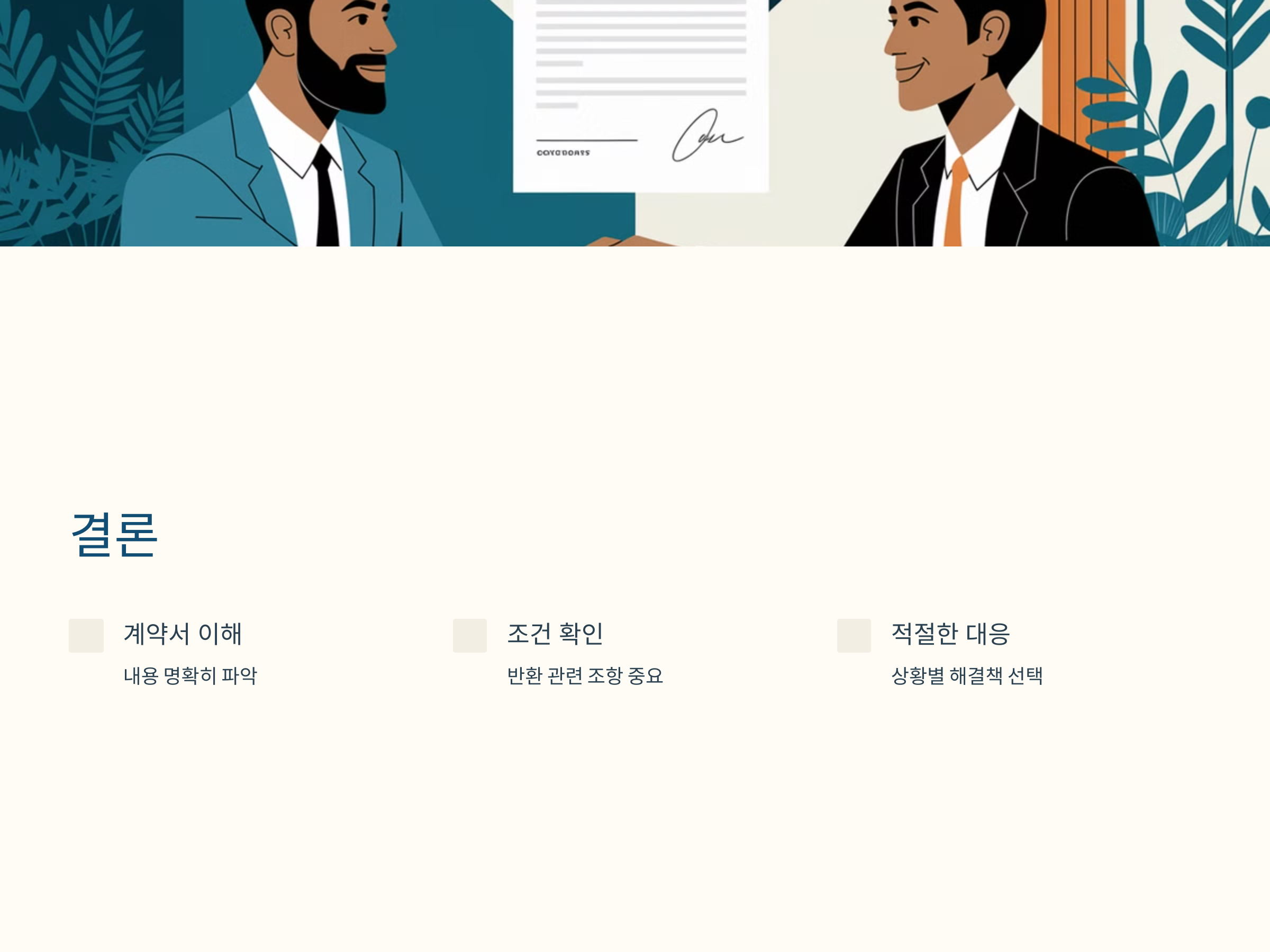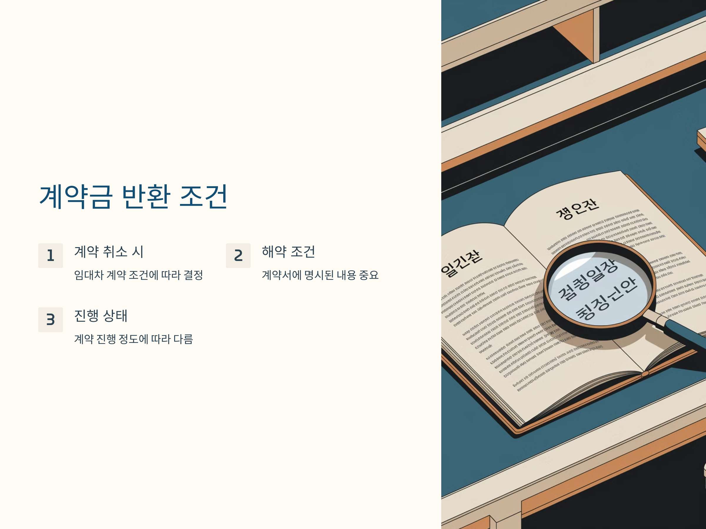 - 계약금 반환 조건은 계약서에 명시된 해약 조건에 따라 다릅니다. 계약이 취소된 경우 반환 여부가 결정됩니다.