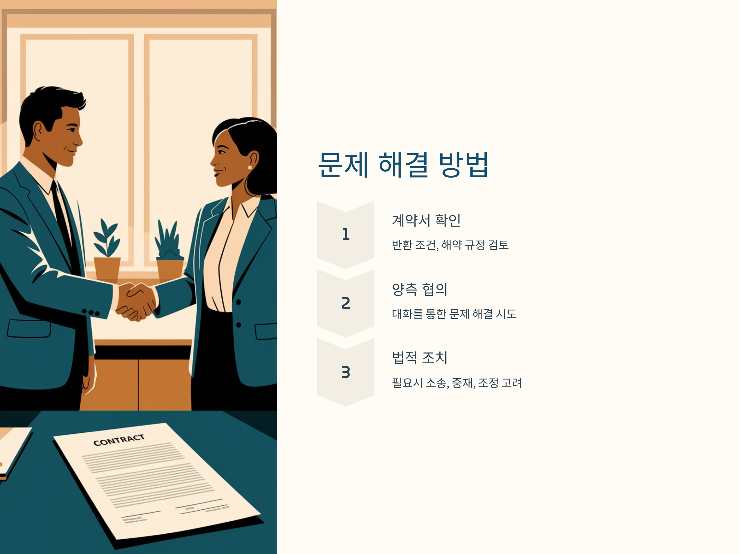 계약금 반환 문제를 해결하려면 우선 계약서의 내용을 꼼꼼히 확인해야 합니다. 계약서에는 계약금 반환 조건, 해약에 대한 규정, 반환 기한 등이 명시되어 있기 때문에 이를 기반으로 대응할 수 있습니다. 만약 계약서에 명시된 조건에 따라 계약금을 반환받을 수 없는 경우라도, 양측 간의 협의를 통해 문제를 해결할 수 있는 가능성도 있습니다.