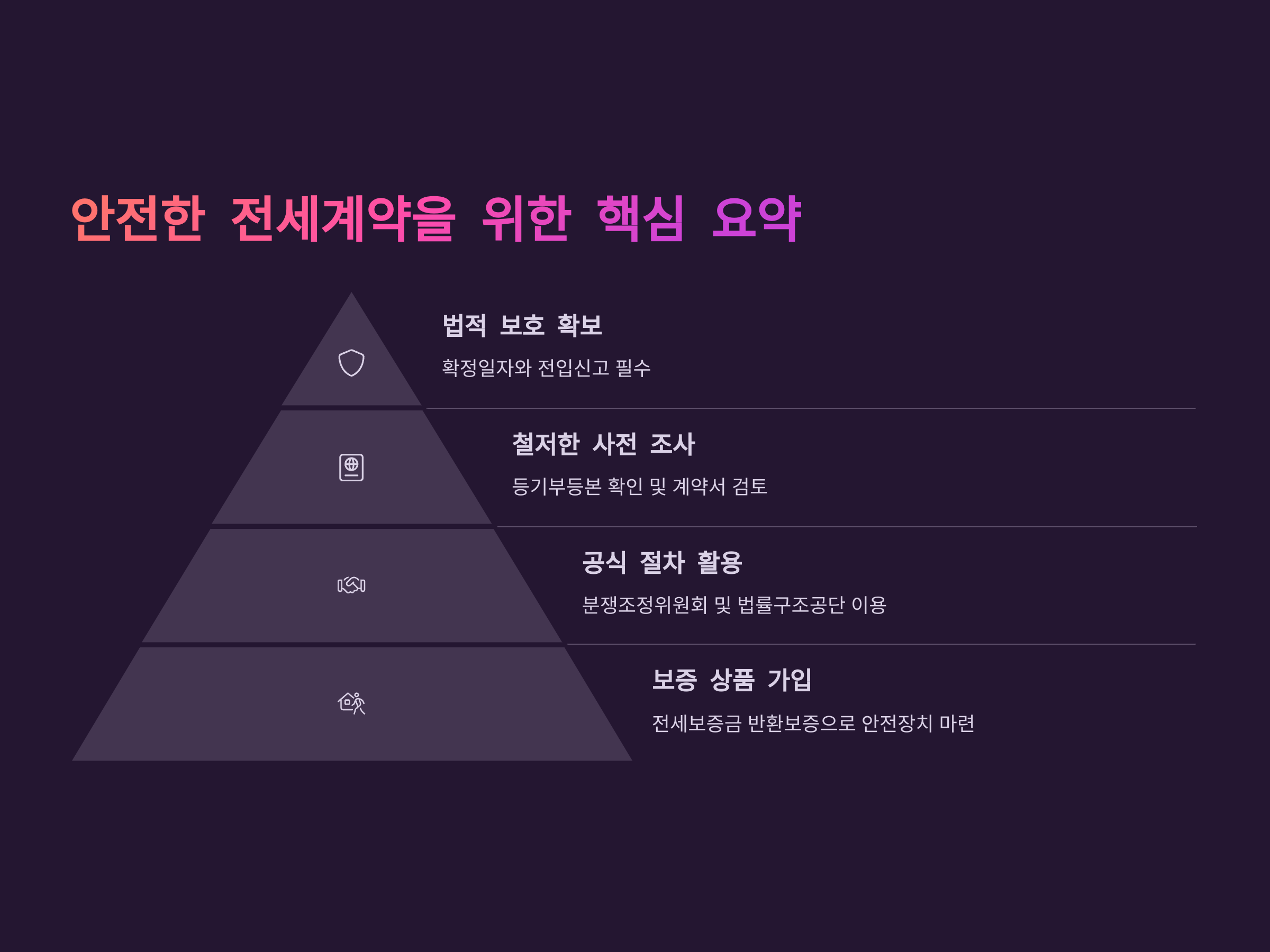 분쟁을 예방하기 위해서는 계약 체결 전부터 철저한 준비가 필요합니다. 먼저 등기부등본을 확인하여 해당 부동산의 실제 소유자와 채무 관계를 반드시 파악해야 하며, 전세권 설정 여부도 함께 점검해야 합니다. 또한 계약 시에는 반드시 ‘확정일자’를 받아두고, 전입신고를 통해 법적 보호를 받을 수 있도록 해야 합니다.