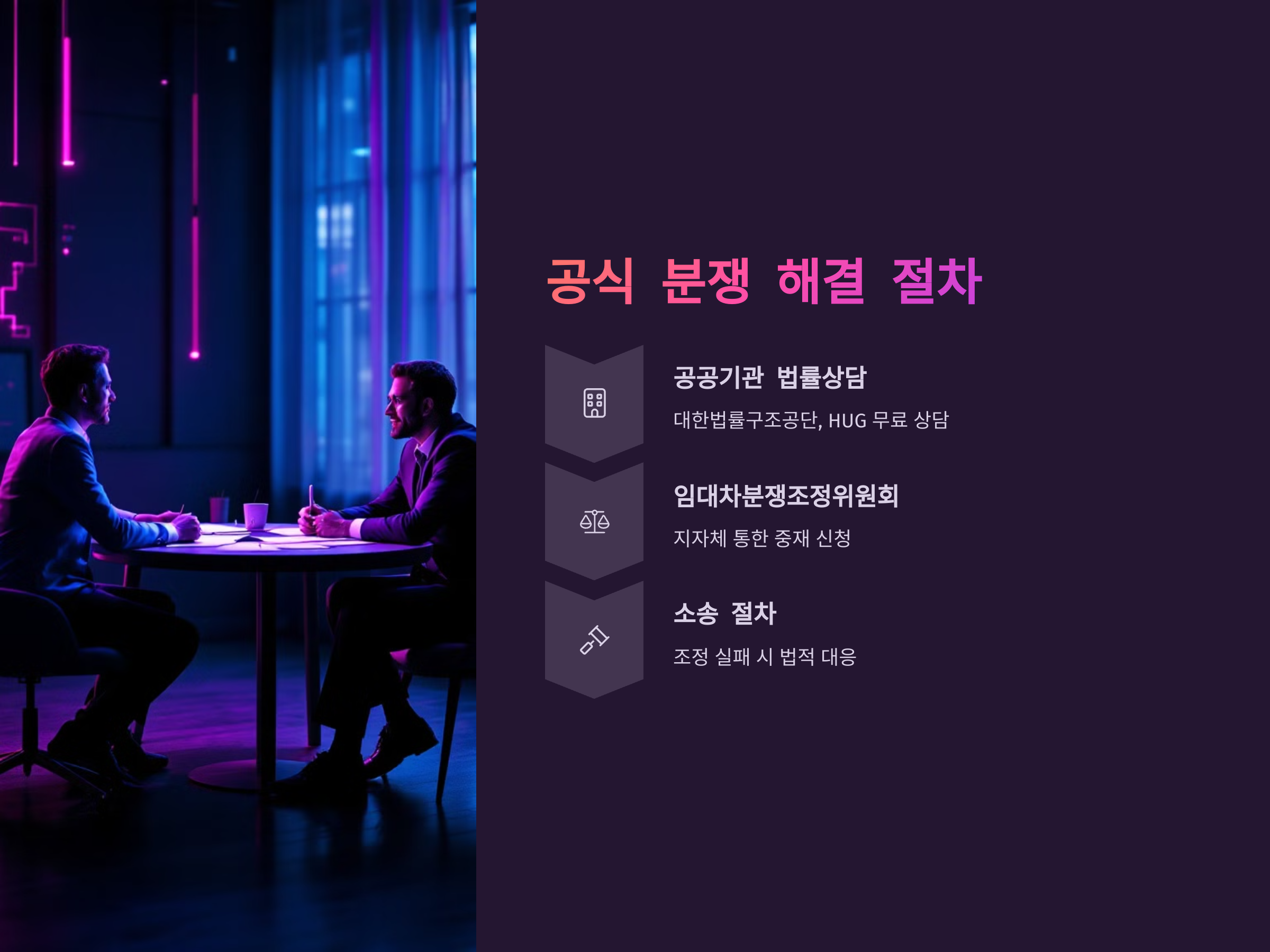 분쟁을 해결하는 공식적인 절차는 생각보다 다양합니다. 첫 번째는 ‘대한법률구조공단’이나 ‘주택도시보증공사(HUG)’와 같은 공공기관을 통한 법률상담입니다. 여기서는 무료로 법률 상담을 제공하며, 분쟁 조정 신청도 가능합니다. 특히 HUG는 전세보증금 반환보증을 통해 보증금 반환을 대행해주는 역할을 하므로 가입 여부에 따라 매우 유용한 수단이 됩니다.
