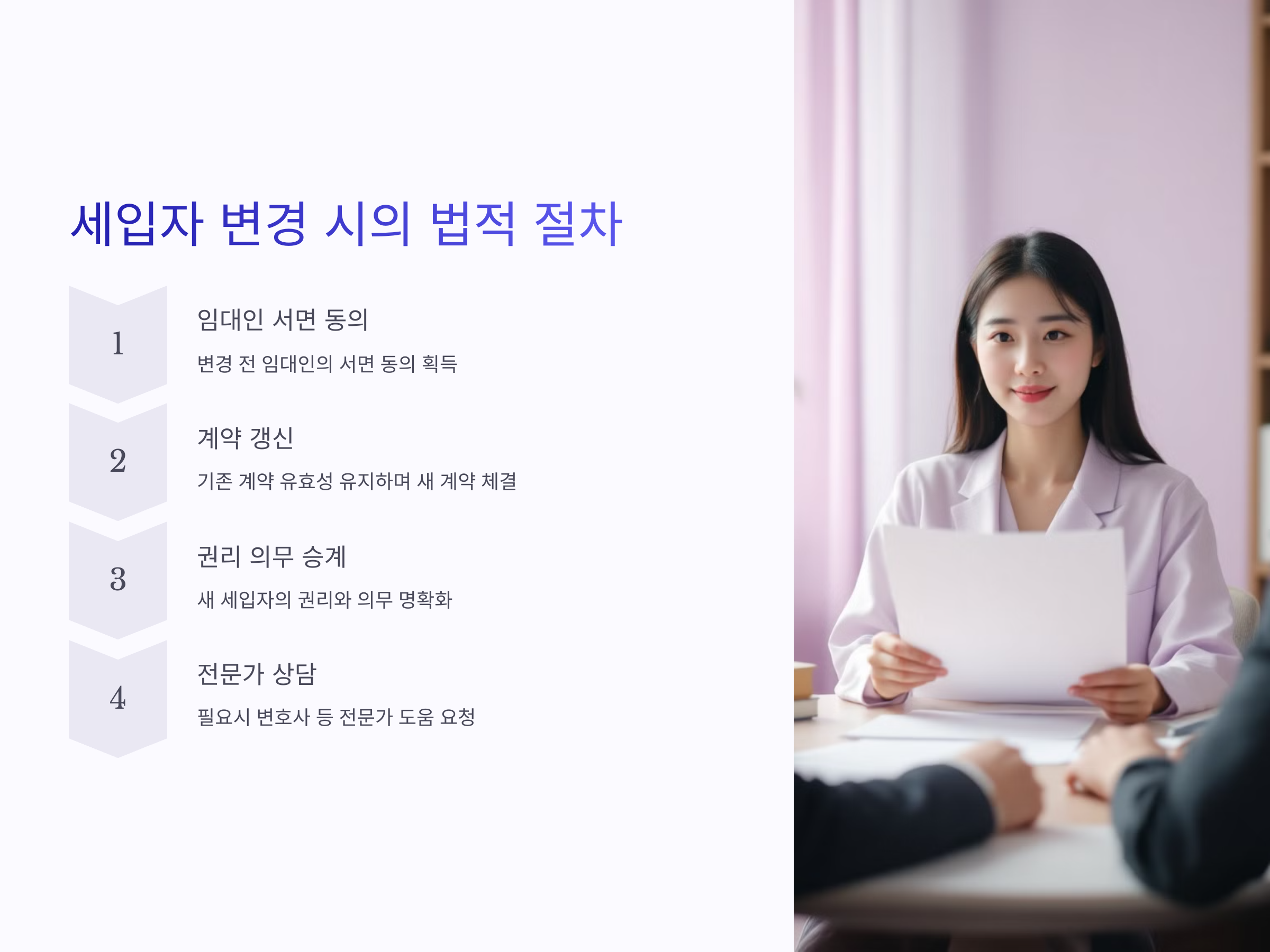 세입자 변경은 기존 세입자와 새로운 세입자 간의 합의뿐만 아니라, 임대인의 동의가 있어야 가능하므로 임대인과의 원만한 협의가 중요합니다. 또한, 세입자 변경이 이루어지면 임대차 계약의 내용이나 조건이 일부 변경될 수 있기 때문에, 이를 모두 명확히 정리한 후 진행해야 합니다.