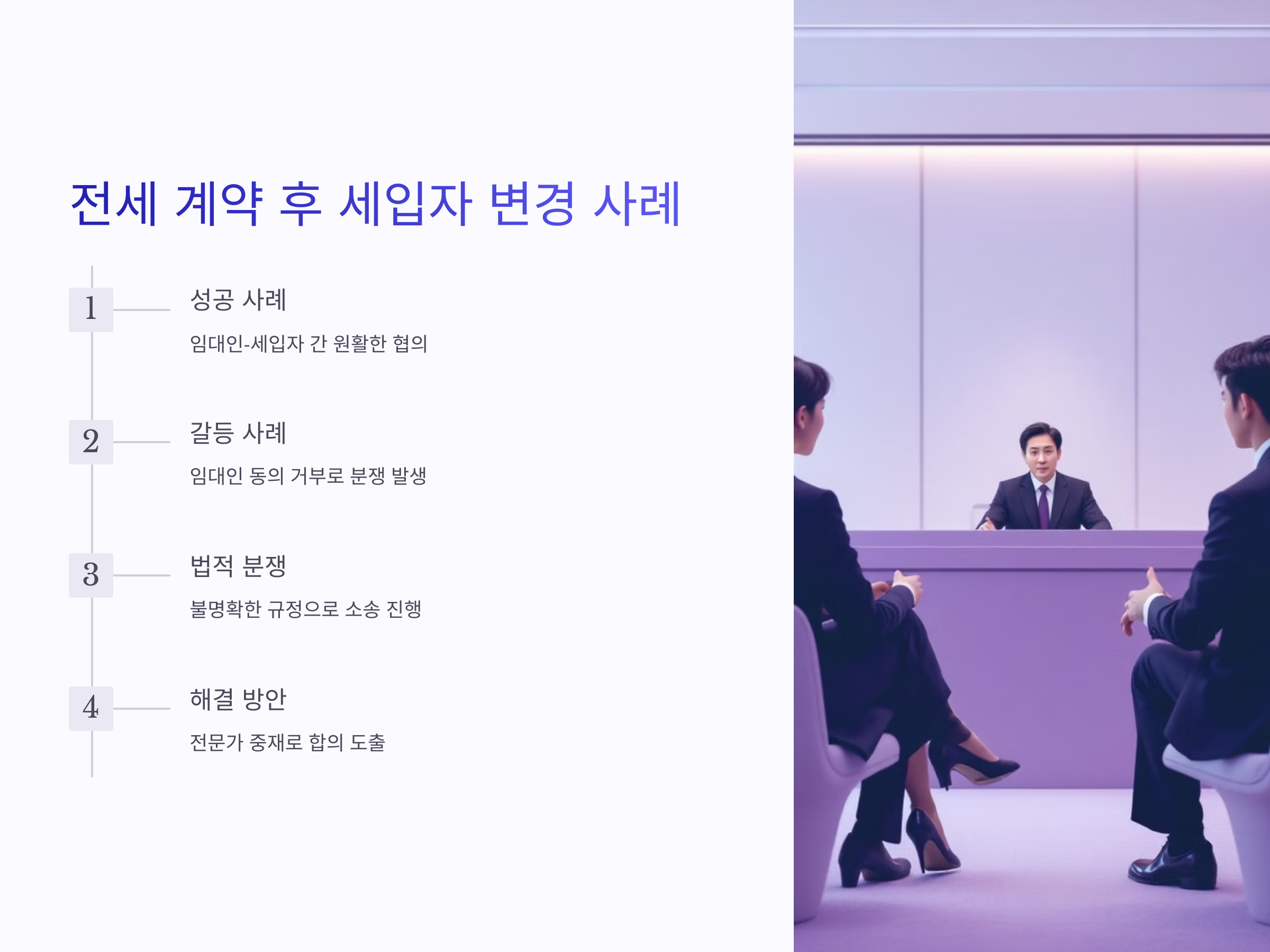 전세 계약 후 세입자 변경이 이루어진 실제 사례들을 보면, 세입자 변경이 원만히 진행된 경우와 그렇지 않은 경우로 나눠집니다. 원만하게 진행된 사례에서는 임대인과 기존 세입자, 새로운 세입자 간의 협의가 잘 이루어졌고, 법적 절차도 충실히 따랐습니다. 반면, 갈등이 발생한 경우는 주로 임대인이 세입자 변경에 동의하지 않거나, 세입자 변경에 대한 규정이 명확히 되어 있지 않아 법적 분쟁이 발생하는 경우가 많았습니다.