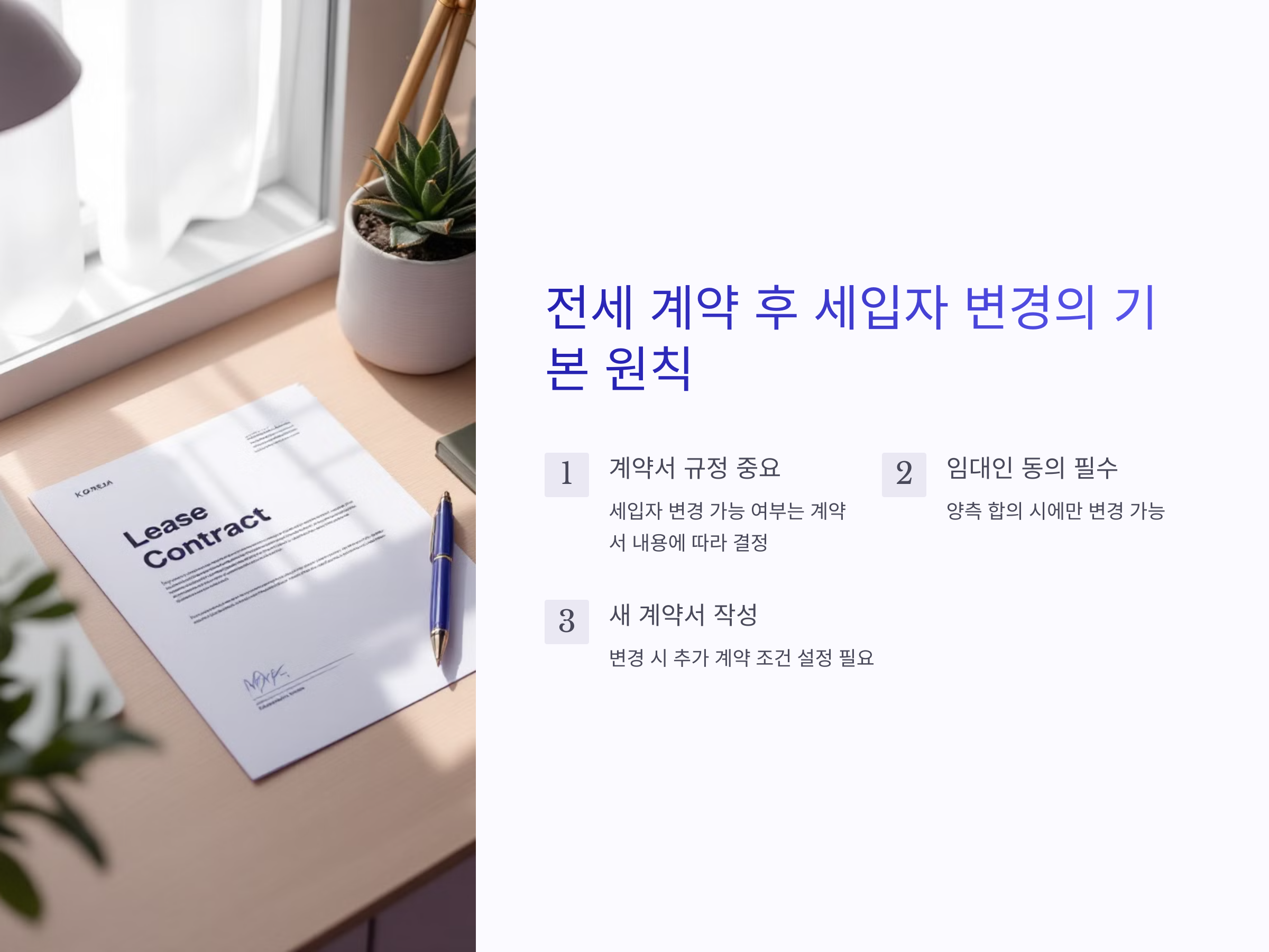 전세 계약 후 세입자 변경이 가능한지 여부는 주로 계약서에 명시된 규정에 따라 달라집니다. 대부분의 전세 계약에서는 임대인과 세입자가 합의한 내용이 중요하게 작용합니다. 계약서에서 세입자 변경에 대한 조항이 없거나, 명시적으로 "세입자 변경 불가"라는 내용이 있다면 변경은 어렵습니다.