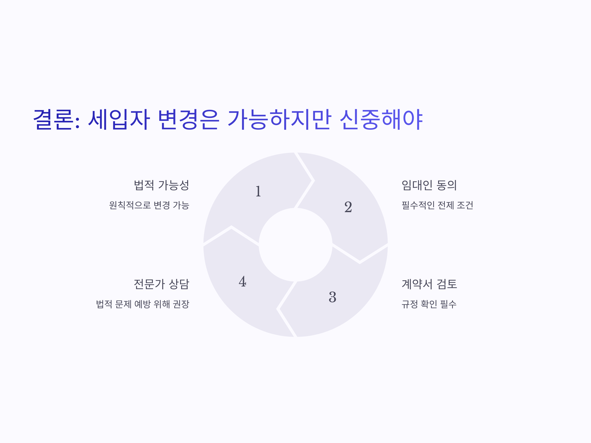 이처럼 세입자 변경을 고려할 때에는 계약서의 규정과 임대인의 동의를 받는 것이 핵심입니다. 또한, 세입자 변경 후 발생할 수 있는 법적 문제를 미리 예방하는 것이 중요합니다.