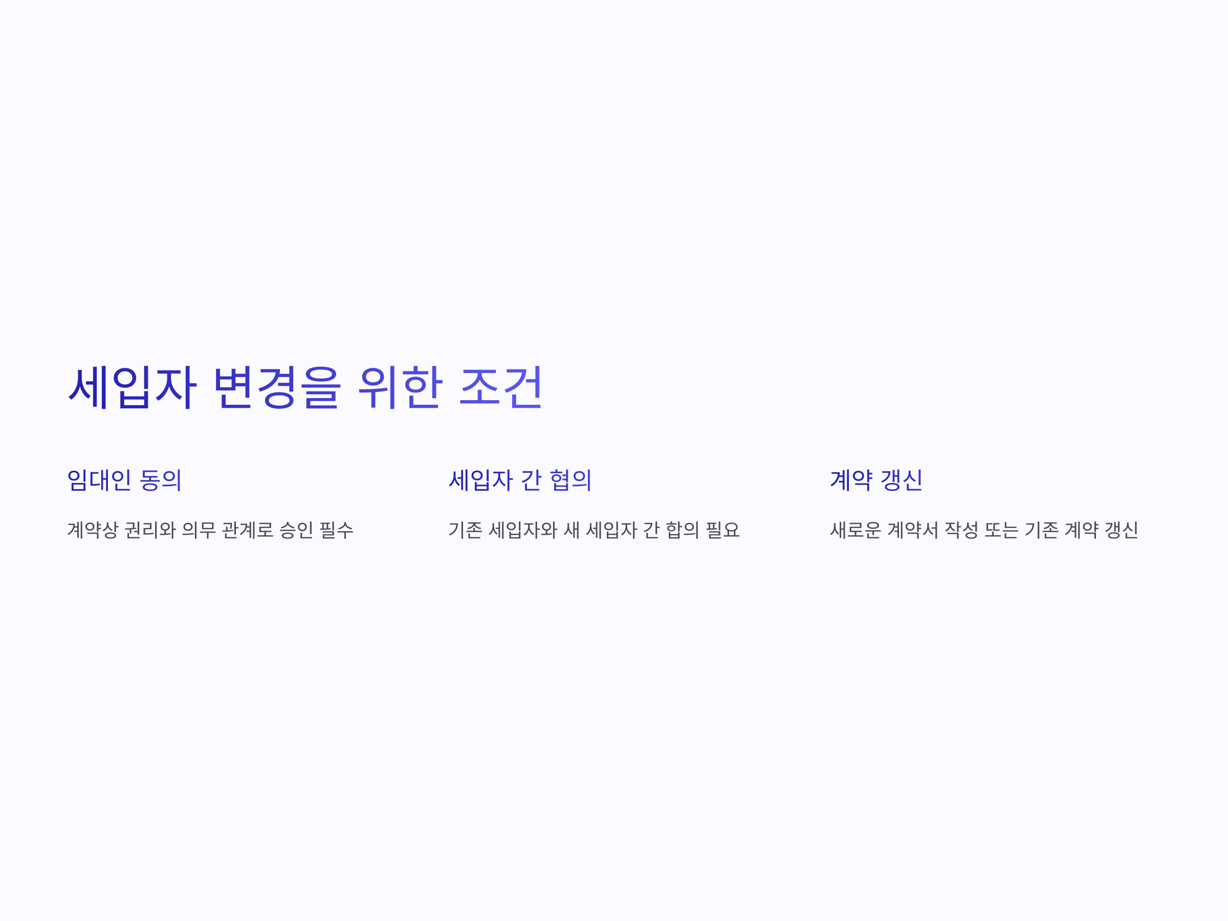 세입자 변경을 위한 조건은 크게 두 가지로 나눌 수 있습니다. 첫째, 임대인의 동의가 필요합니다. 임대인은 계약상 권리와 의무를 갖고 있기 때문에, 세입자가 변경될 경우 그 변경을 승인해야 합니다. 둘째, 세입자 변경을 위한 절차가 필요합니다. 세입자 변경을 원하는 경우, 기존 세입자와 새로운 세입자 간의 협의가 필요하며, 이를 위해서는 새로운 세입자와의 계약서를 작성하거나 기존 계약을 갱신하는 등의 절차를 밟아야 할 수 있습니다.