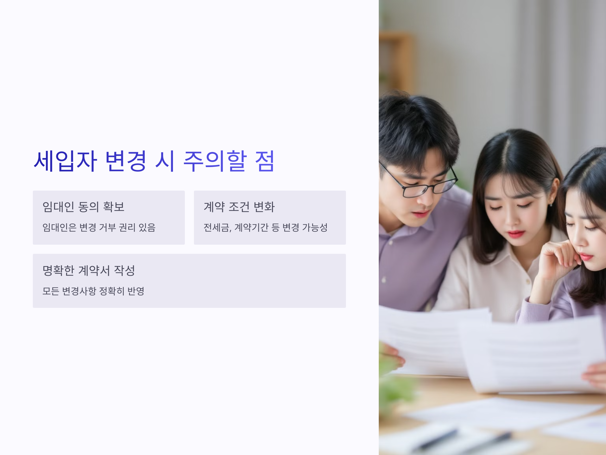 세입자 변경을 원하시는 경우, 신중하게 계약 조건을 검토하고, 임대인과 협의하여 원만한 해결을 보시길 바랍니다.