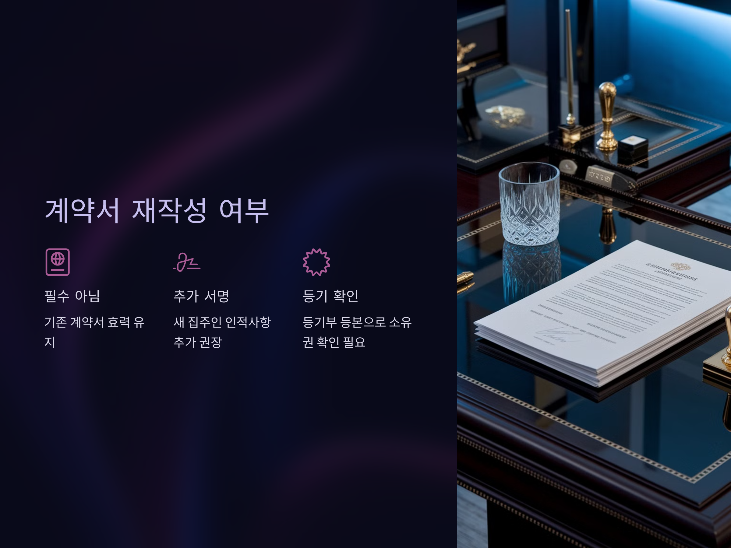 집주인이 변경되었다고 해서 반드시 계약서를 다시 작성해야 하는 것은 아닙니다. 기존 계약서의 효력은 그대로 유지되며, 새로운 집주인은 이를 승계합니다. 그러나 새로운 집주인의 인적 사항을 계약서에 추가하고 서명 또는 날인을 받아두면 추후 발생할 수 있는 문제를 예방할 수 있습니다. 이때, 등기부 등본을 확인하여 새로운 집주인의 소유권 및 부동산 상태를 확인하는 것이 중요합니다.