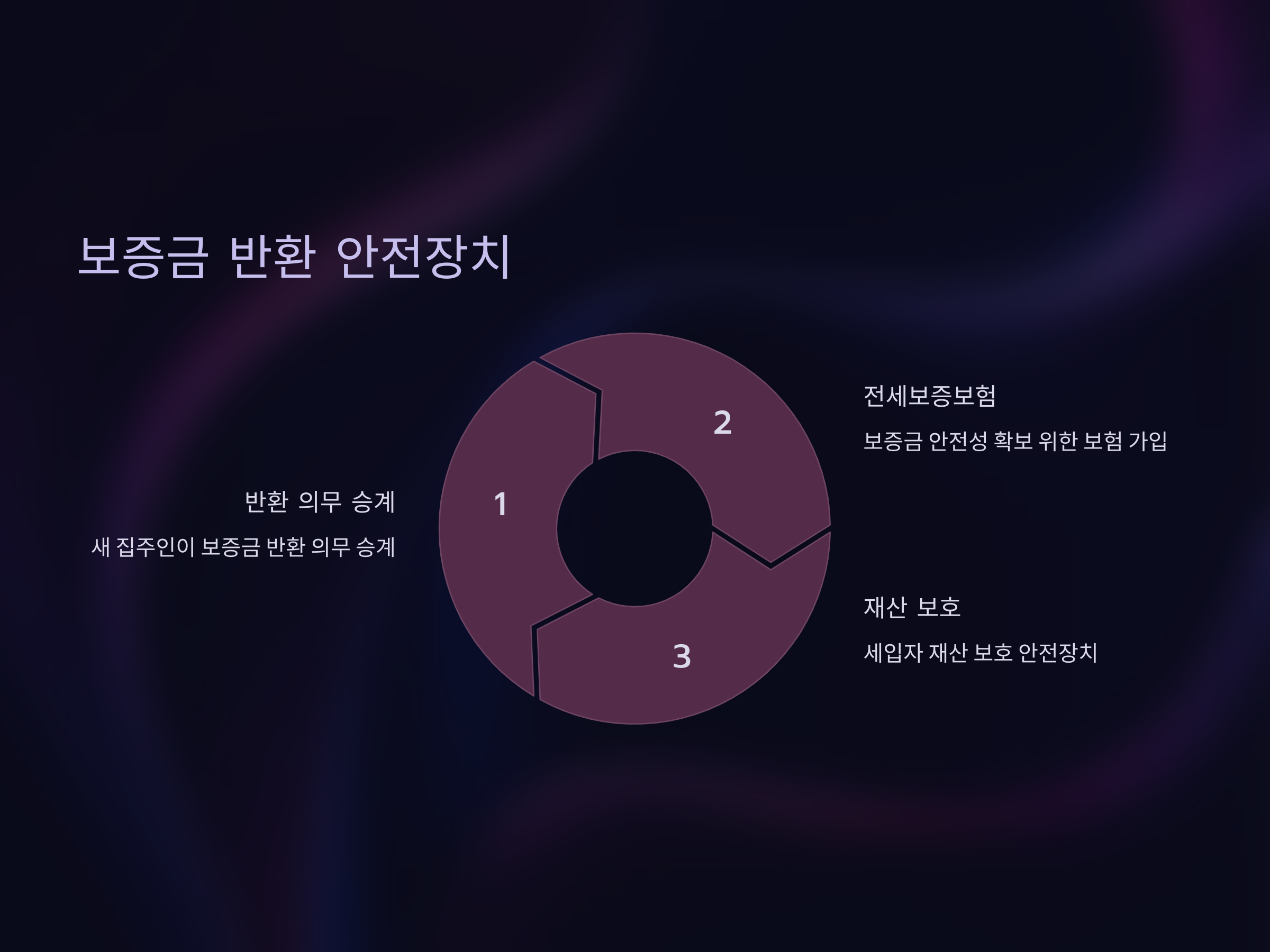 새로운 집주인은 기존 보증금을 반환할 의무를 승계합니다. 따라서 세입자는 보증금 반환에 대해 걱정할 필요는 없습니다. 그러나 보증금의 안전성을 더욱 확보하기 위해 전세보증보험에 가입하는 것을 고려할 수 있습니다. 전세보증보험은 집주인이 보증금을 반환하지 못하는 상황에 대비한 안전장치로, 세입자의 재산을 보호하는 데 큰 역할을 합니다.