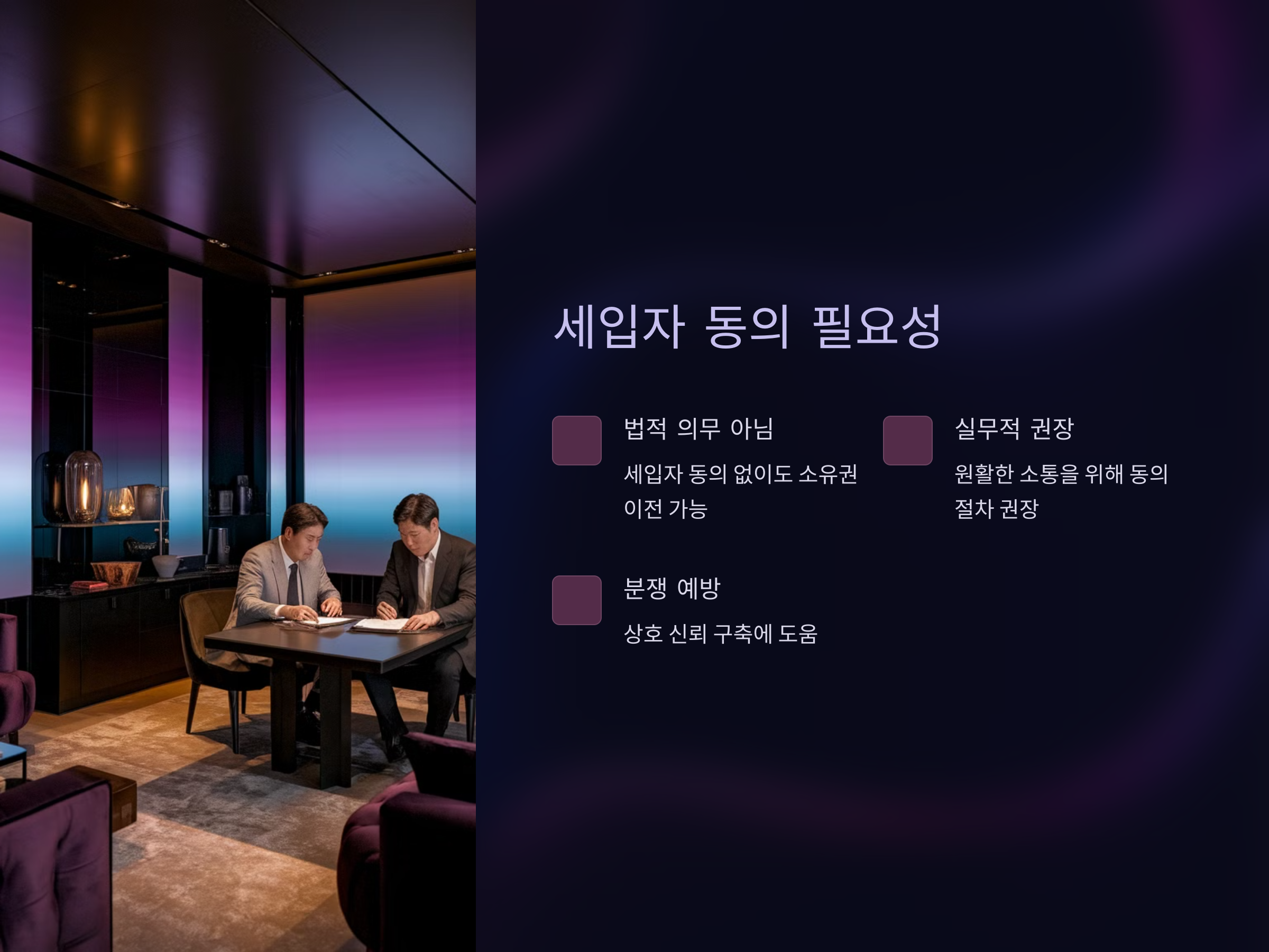 집주인이 변경될 때, 세입자의 동의가 반드시 필요한 것은 아닙니다. 법적으로 새로운 집주인은 기존 임대차 계약을 승계하게 되어 있으므로, 세입자의 동의 없이도 소유권 이전이 가능합니다. 그러나 실무적으로는 새로운 집주인과 세입자 간의 원활한 소통을 위해 동의 절차를 거치는 것이 바람직합니다. 이는 향후 발생할 수 있는 분쟁을 예방하고, 상호 신뢰를 구축하는 데 도움이 됩니다.